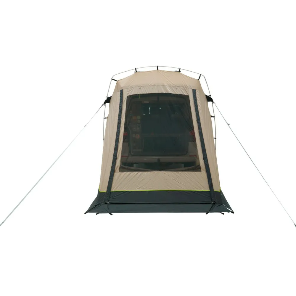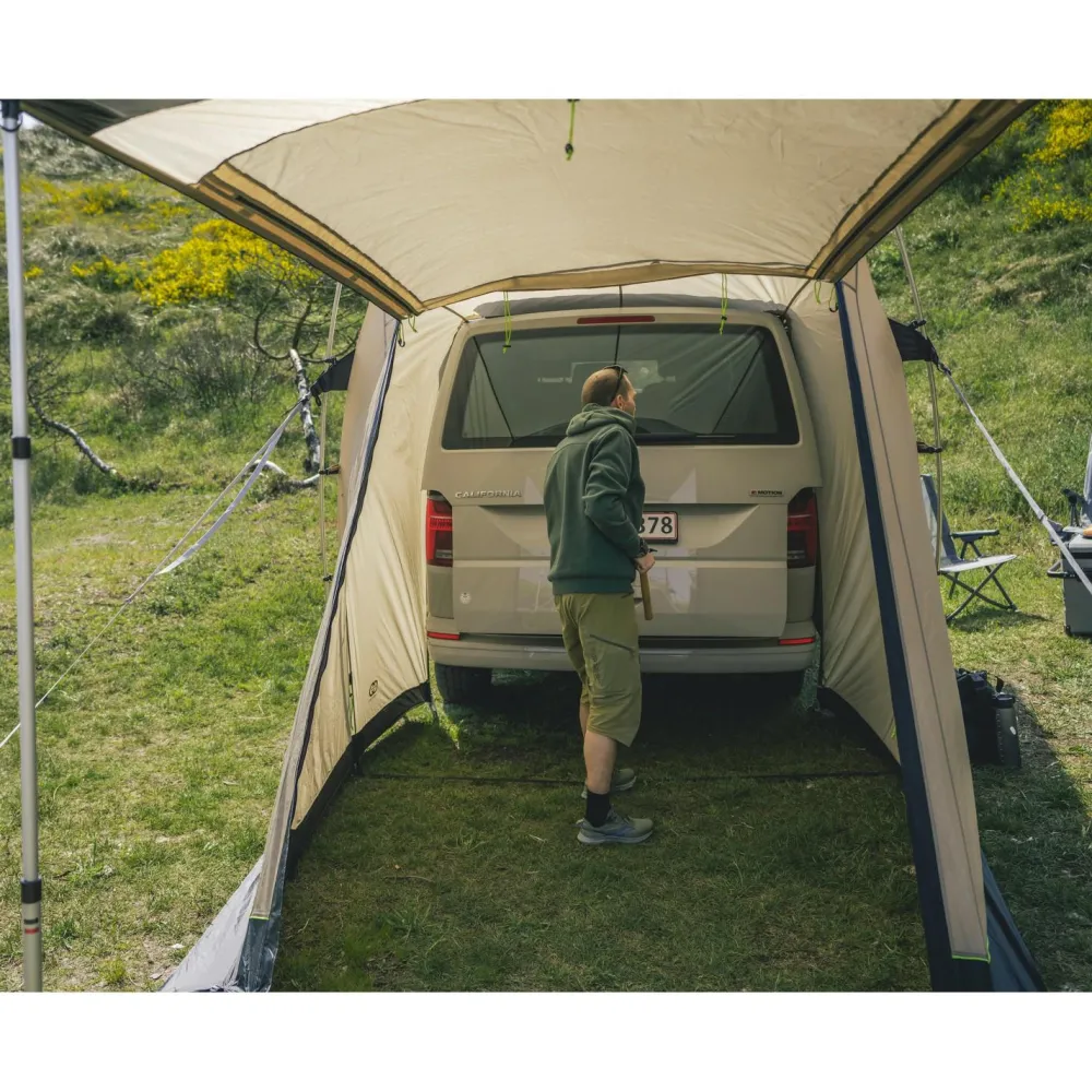 Konzipiert ist das Vorzelt für Fahrzeuge wie VW T5, T6 und T6.1 sowie Mercedes V-Klasse, Vito oder Marco Polo. Die Befestigung erfolgt über das Vehicle Attachment System, das den Zugang zu den seitlichen Fahrzeugtüren freihält. Die Heckklappe kann sowohl geschlossen und verriegelt als auch innerhalb des Zelts geöffnet werden. Ein großes Mesh-Fenster mit wasserdichtem Vorhang unterstützt die Belüftung, während aufrollbare Seitenpaneele einen geschützten Zugang ermöglichen.