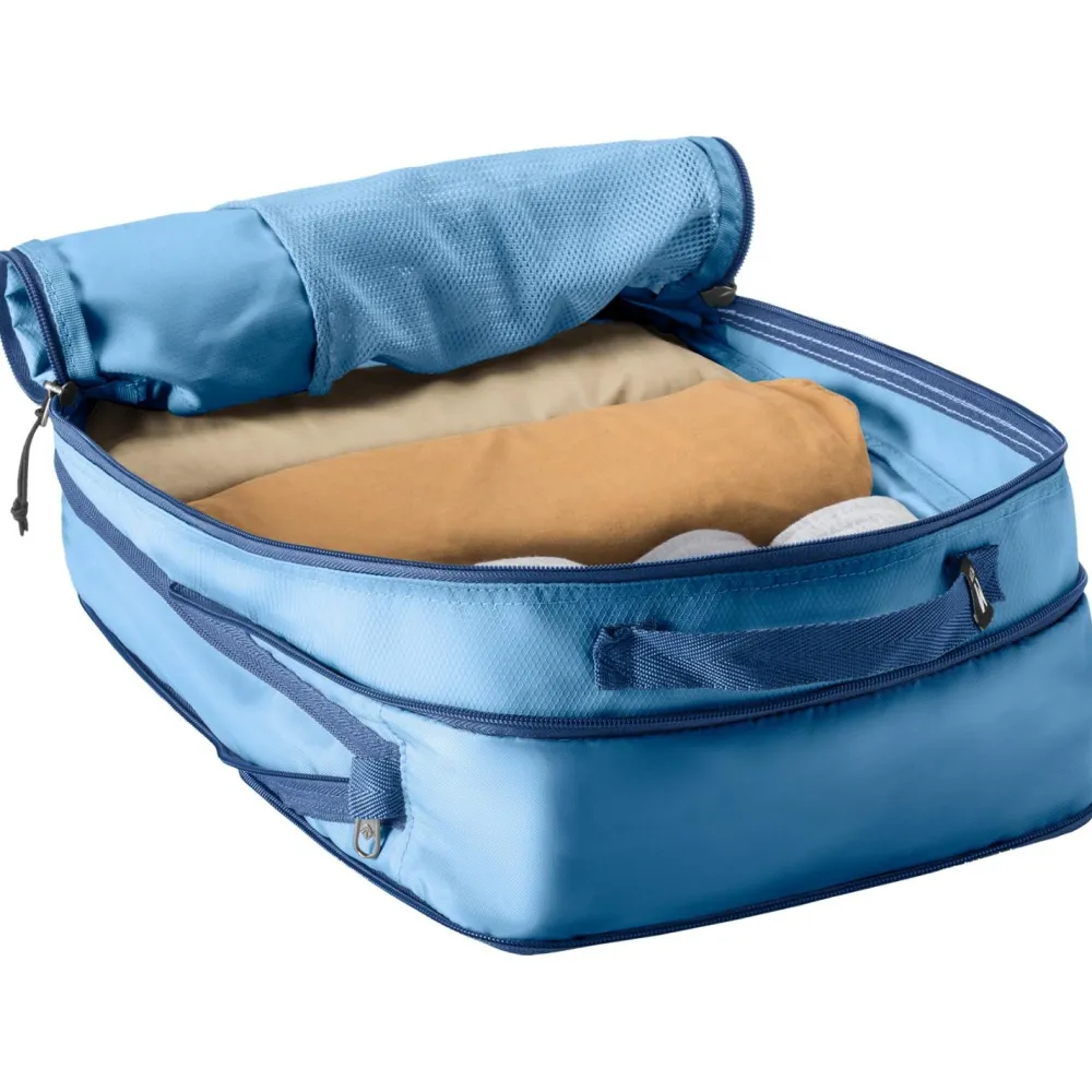 Der Pack-It Reveal Expansion Cube M Packsack von Eagle Creek kommt mit robusten und nachhaltigen Materialien daher. Diese schrecken vor unsanften Berührungen auf Reisen nicht zurück und bestehen aus recycelten Fasern. Für ein einfaches und angenehmes Handling ist der Packsack mit einem Tragegriff ausgestattet. Der Erweiterungs-Reißverschluss bietet die Möglichkeit, das Volumen bei Bedarf zu vergrößern. Pullover, Jacken und andere Gegenstände freuen sich schon auf eine ordentlich sortierte Reise.