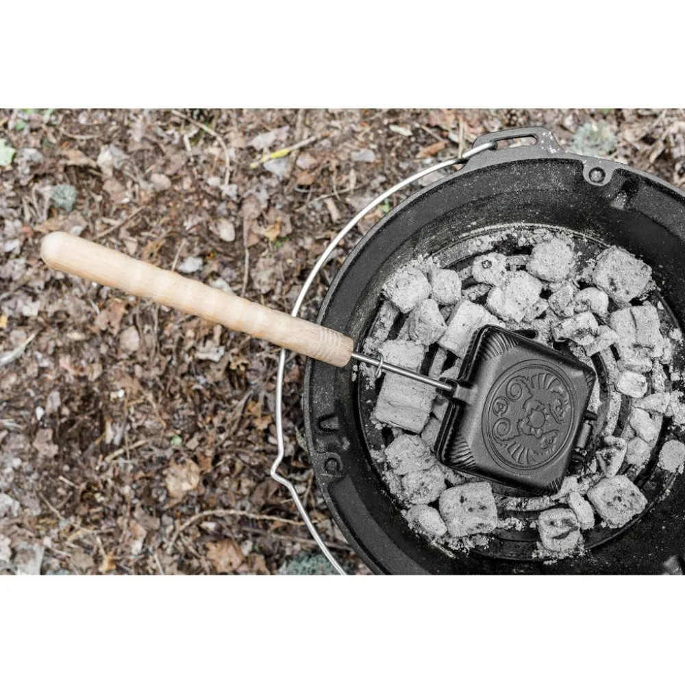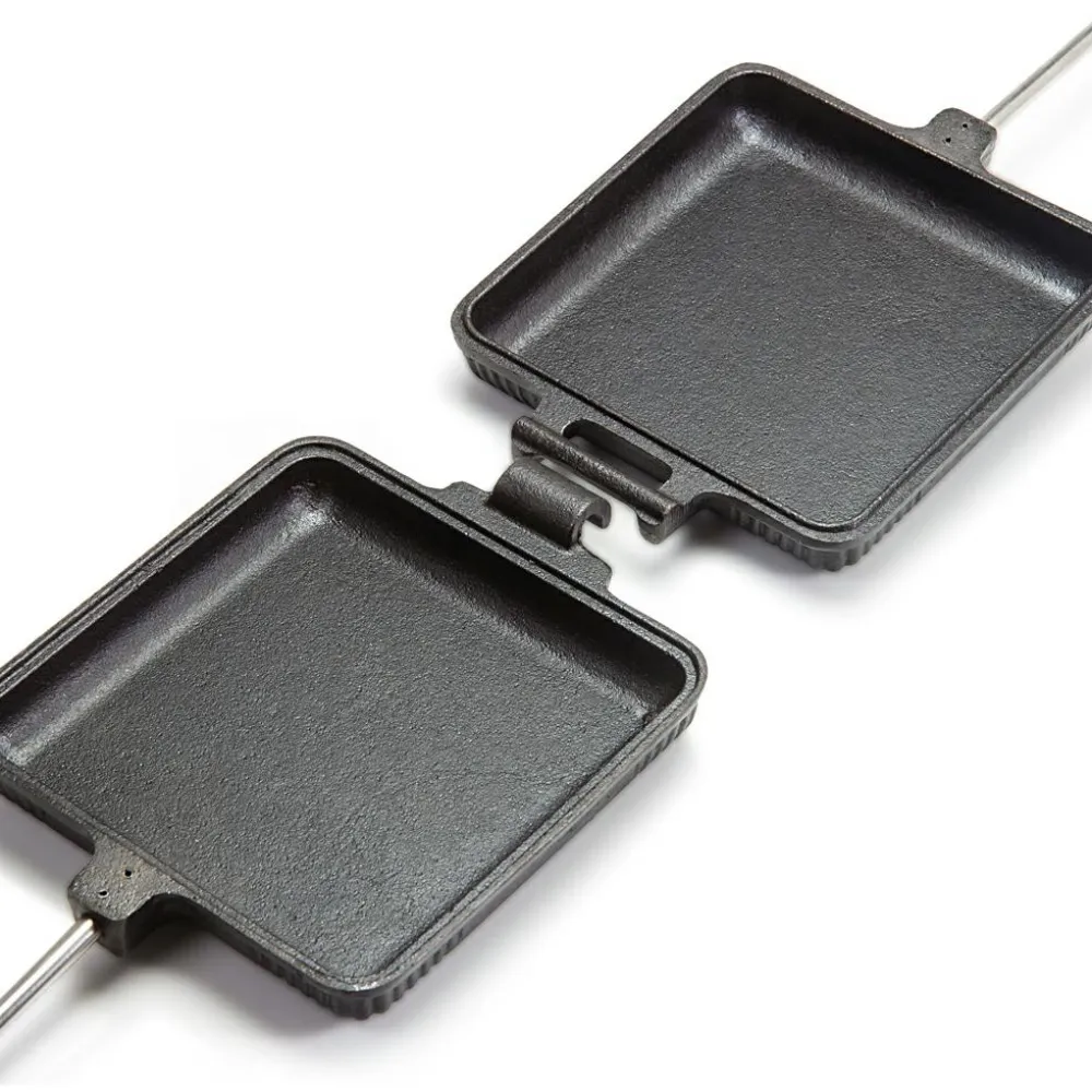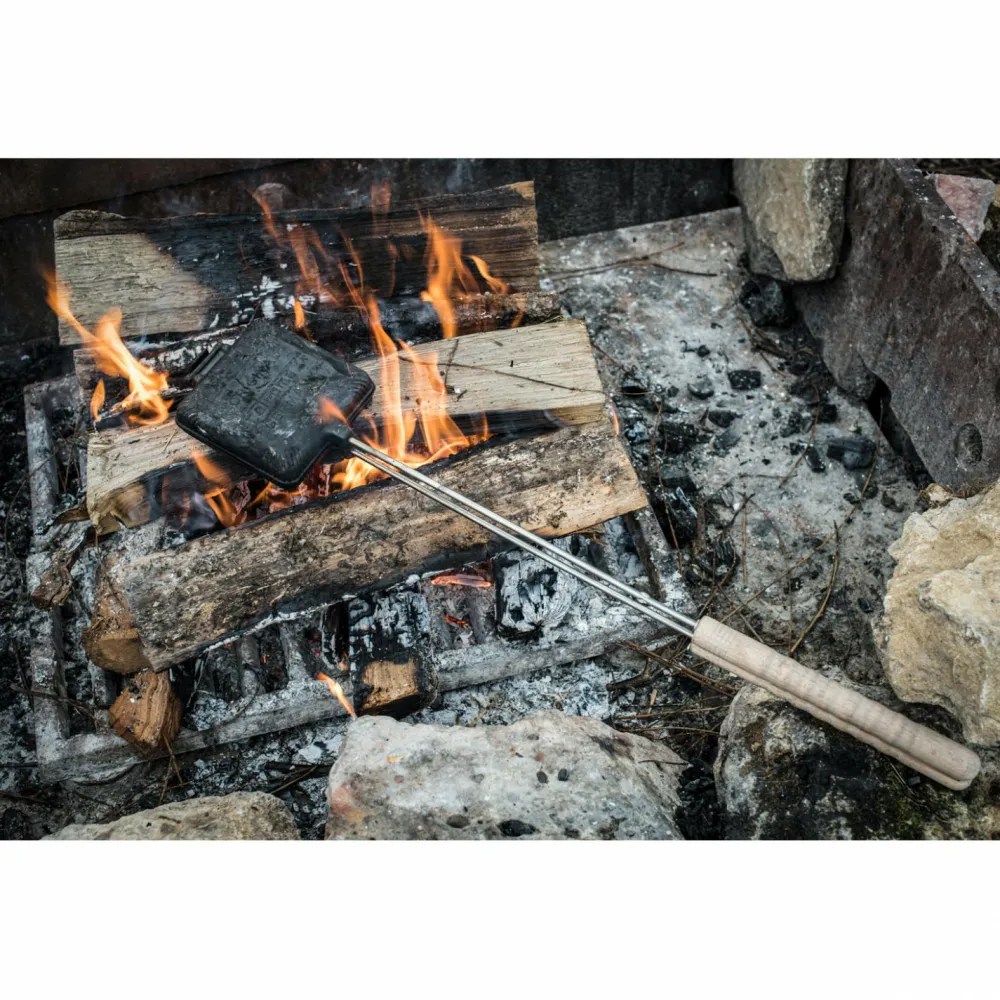 Ein gelungenes Essen garantiert das Sandwich-Eisen von Petromax! Der Verschlusshaken hält die Hälften der Eisen sicher zusammen. Die Materialeigenschaften des Gusseisens ermöglichen sowohl das Anbraten als auch das Nutzen der Restwärme zum Ausbacken oder Garen. Der Stiel hält Deine Hand in sicherem Abstand zum Feuer.