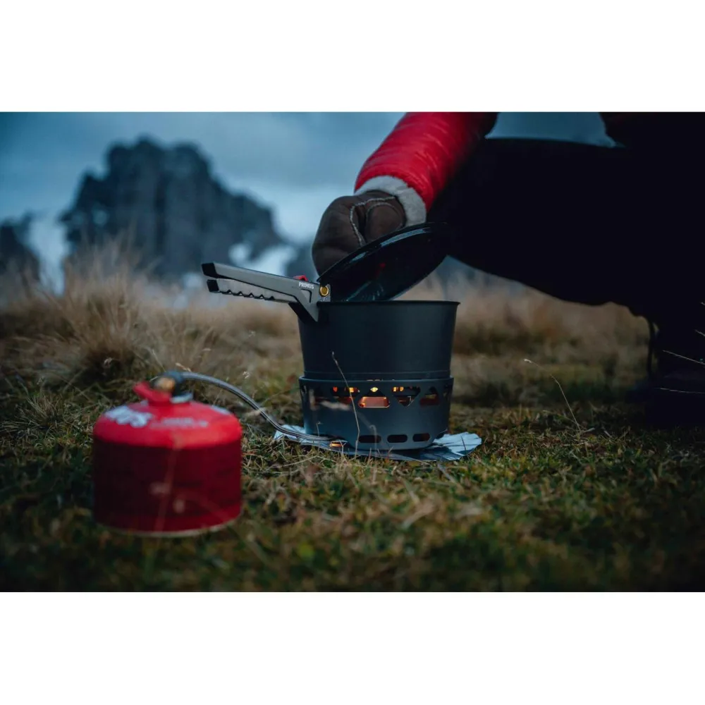 Der PrimeTech Stove punktet mit einem niedrigen Schwerpunkt durch externe Kartuschenanbindung – für extra Stabilität. Der Brenner besitzt eine integrierte Windsicherung und die Laminar-Flow-Technologie für zuverlässige Leistung. Mit einer Leistung von 2.000 Watt bringt er einen Liter Wasser in nur 3,5 Minuten zum Kochen. Durch den Wärmetauscher im Topf und den integrierten Windschutz wird der Gasverbrauch halbiert – ideal für lange Touren mit wenig Gepäck.