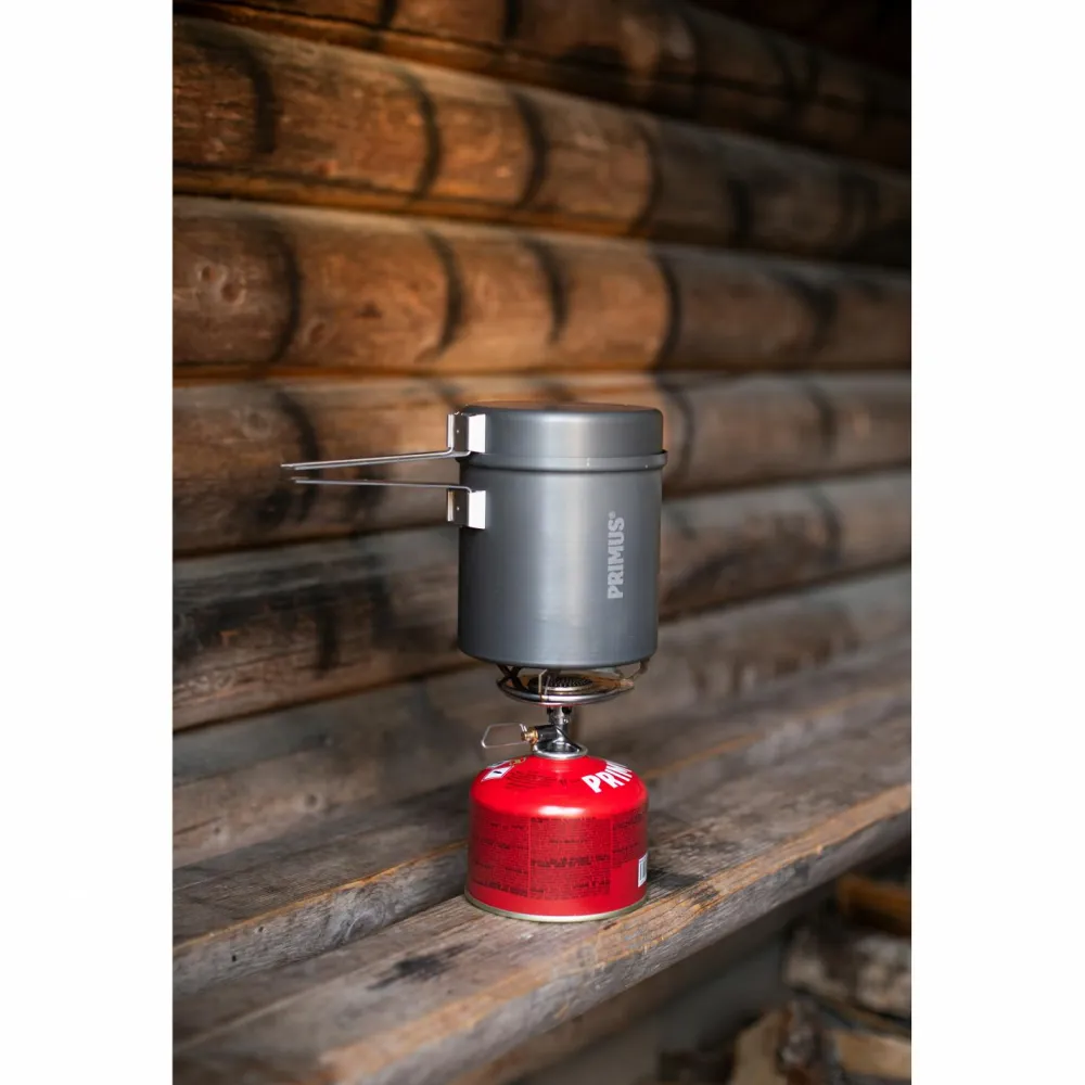 Der Trek Pot 1.0 von Primus besteht aus eloxiertem Aluminium, welches mit einer Antihaft-Beschichtung aus Keramik veredelt wurde. Der Topfboden ist etwas dicker und besitzt eine Rillenstruktur – so wird die Hitze gleichmäßig verteilt und das Essen brennt nicht zu schnell an. Die Pfanne kann auch als Deckel genutzt werden und ist ebenfalls mit einer Antihaft-Beschichtung versehen. Mit einem der beiden Griffe kann sie für den Transport sicher am Topf fixiert werden. Der andere findet im inneren Platz.