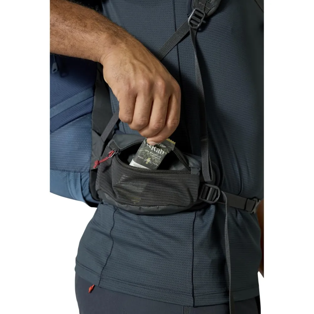 Dank verstellbarer Rückenlänge, Hüftgurt mit Zipper-Taschen und großen Mesh-Fächern hast Du schnellen Zugriff auf Snacks, Ausrüstung oder Wertsachen. Die integrierte Regenhülle schützt bei wechselhaftem Wetter, während die Stockhalterung mit Bungee-System Deine Ausrüstung sicher fixiert.