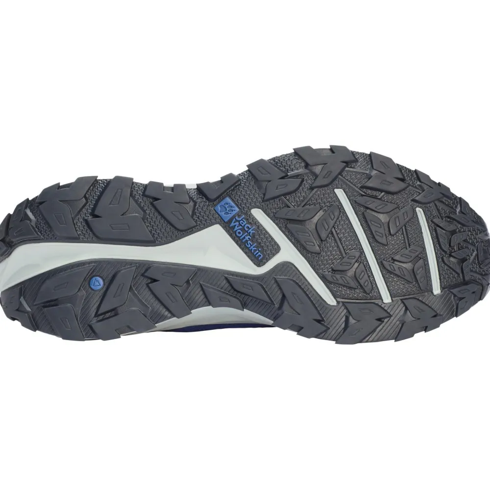 Die speziell entwickelte Gummi-Laufsohle bietet Dir festen Halt selbst auf anspruchsvollen alpinen Trails – so bleibst Du auch bei Nässe sicher unterwegs. Mit der federnden EVA-Zwischensohle werden Stöße effektiv abgefangen und Deine Gelenke geschont. Das leichte und robuste Synthetik-Obermaterial hält einiges aus und trägt sich angenehm – ganz nach dem Motto von Jack Wolfskin: Technik aus Deutschland trifft Abenteuerlust.