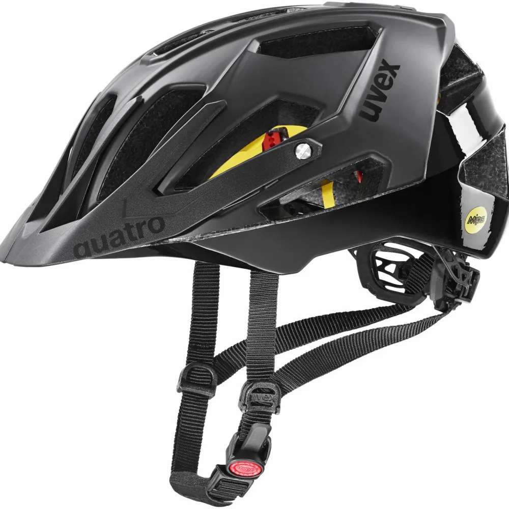 Der Quatro CC MIPS von Uvex ist ein Radhelm, der sich bestens zum Mountainbiken empfiehlt und durch eine herausragende Passform sowie Sicherheit überzeugt. Hergestellt wurde er im sogenannten Double-In-Mold-Verfahren bei der EPS-Schaum mit einer Polycarbonatschale fusionieren. Für zusätzliche Sicherheit sorgt das MIPS-System: Im Falle eines abgewinkelten Aufpralls kann MIPS schädliche Rotationskräfte reduzieren, die auf das Gehirn übertragen werden können.