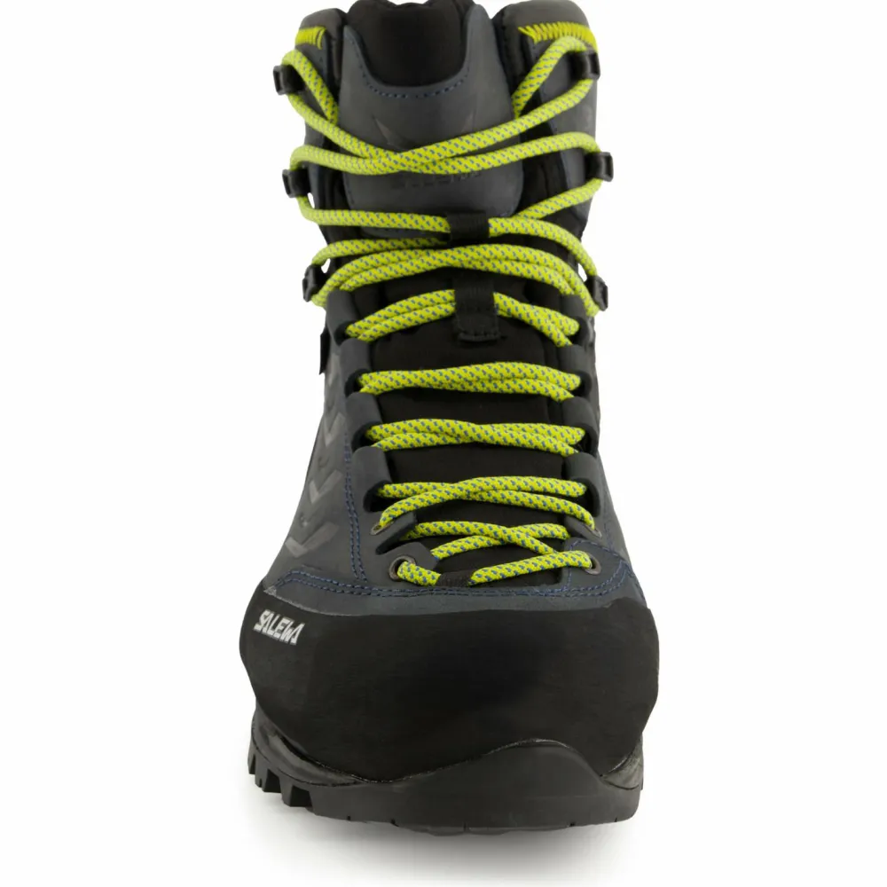 Das Zuhause des Rapace GTX Bergschuhs ist vorallem das gemischte alpine Gelände. Hauptsächlich auf felsigen und technischen Wegen fühlt sich der Rapace äußerst wohl. Dank seiner steifen Sohle bietet er hervorragenden Halt und zeigt, dass er sich auch in Sachen Kletterperformance ganz und gar nicht verstecken muss. Die spezielle Schnürung im Frontbereich lässt den Schuh individuell optimal anpassen, sodass auch kleine Tritte punktgenau belastet werden können. Die Vibram-Sohle des Rapace GTX Bergschuh sorgt für sicheren Halt auf unterschiedlichen Untergründen. Auch die integrierte Bilight-Midsole-Konstruktion steht für Langlebigkeit und Strapazierfähigkeit. Die ergonomische Form der Mittelsohle sorgt auch in steilem Gelände für beste Polsterungs- und Dämpfungseigenschaften. Um Steinschläge und Stöße zu vermeiden, schützt eine robuste 360° Vollgummi-Ummantelung das hochwertige 1,8mm Nubukleder. Für einen angenehmen Tragekomfort und die nötige Flexibilität im Knöchelbereich sorgt das Flex-Collar System im Schaft des Rapace-Bergschuhs. Die integrierte GORE-TEX Membran schützt den Fuß dauerhaft vor Feuchtigkeit und Nässe. Ein äußerst standfester Unterstützer im Erklimmen von anspruchsvollen Gipfeln: Der Rapace GTX Bergschuh von Salewa.