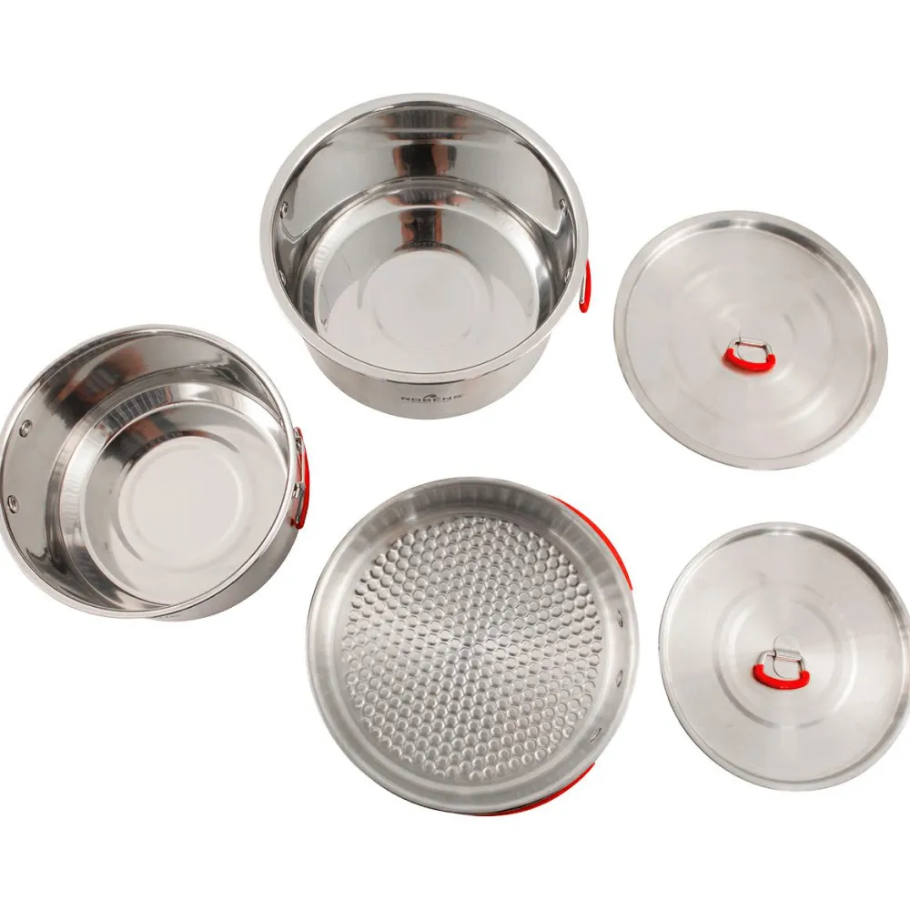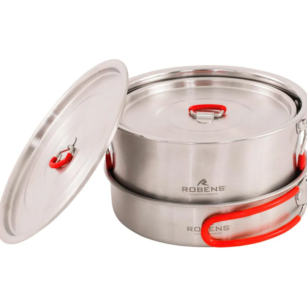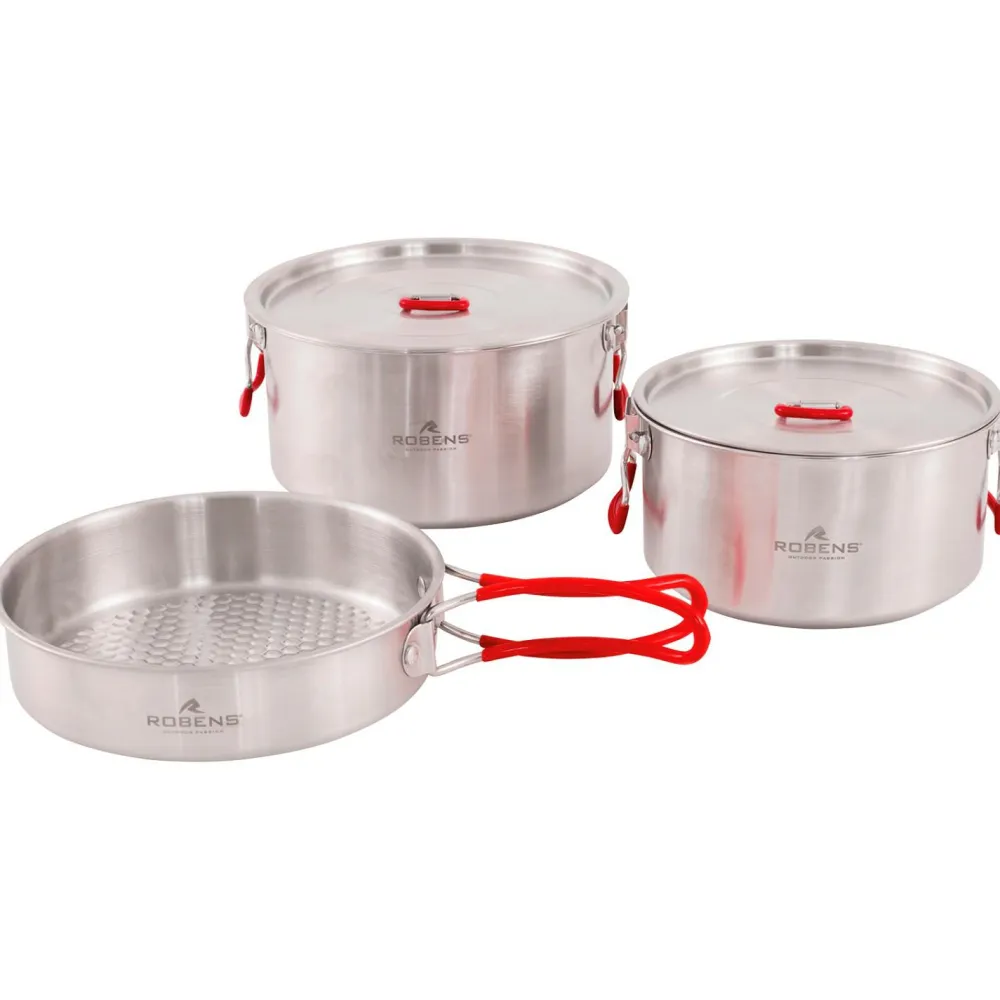 Das Sierra Steel Cook Set ist ein extrem langlebiges, geschmacks- und geruchsneutrales sowie spülmaschinenfestes Kochset für die Outdoor-Küche. Es besteht aus zwei Töpfen mit 1600 ml und 1400 ml Volumen, einer Pfanne mit 19,5 cm Durchmesser und einer praktischen Mesh-Aufbewahrungstasche. An Materialien kommen starker, rostfreier Stahl und Edelstahlgriffe mit schützenden Silikonüberzügen zum Einsatz.