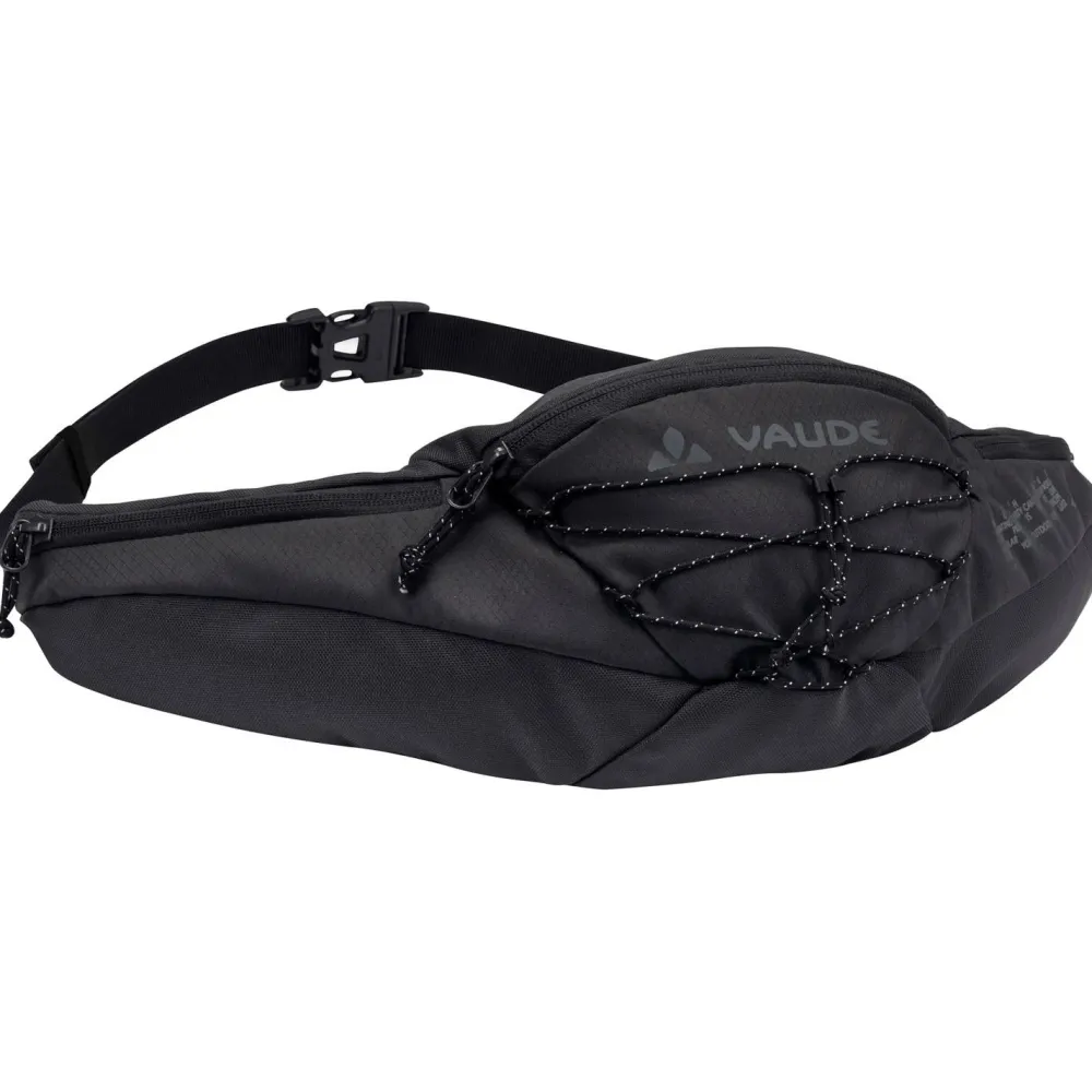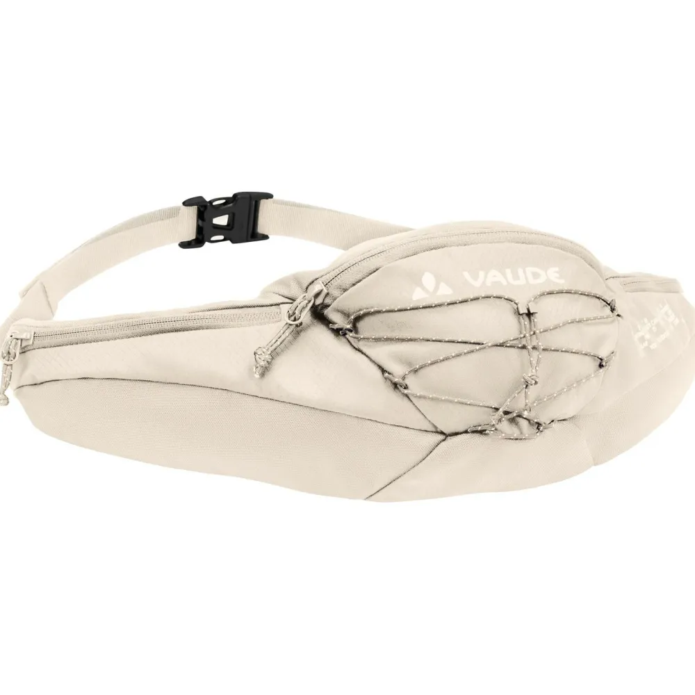 Vaude fertigt die Elope Pack 2 Hüfttasche aus einer umweltfreundlichen Materialmischung mit recyceltem Polyester. Für maximale Stabilität und guten Wetterschutz kommt PU-beschichtetes Polyester in verschiedenen Materialstärken zum Einsatz. Die sportliche Hüfttasche verfügt über drei Fächer mit Reißverschluss und ist am Rücken gepolstert. Der Hüftgurt lässt sich individuell anpassen. Neben 2 Liter Volumen steht eine praktische Gummizughalterung als extra Befestigungsmöglichkeit bereit. Bis zu 4 kg Equipment lassen sich mit der Tasche beim Wandern und Radfahren bequem transportieren.