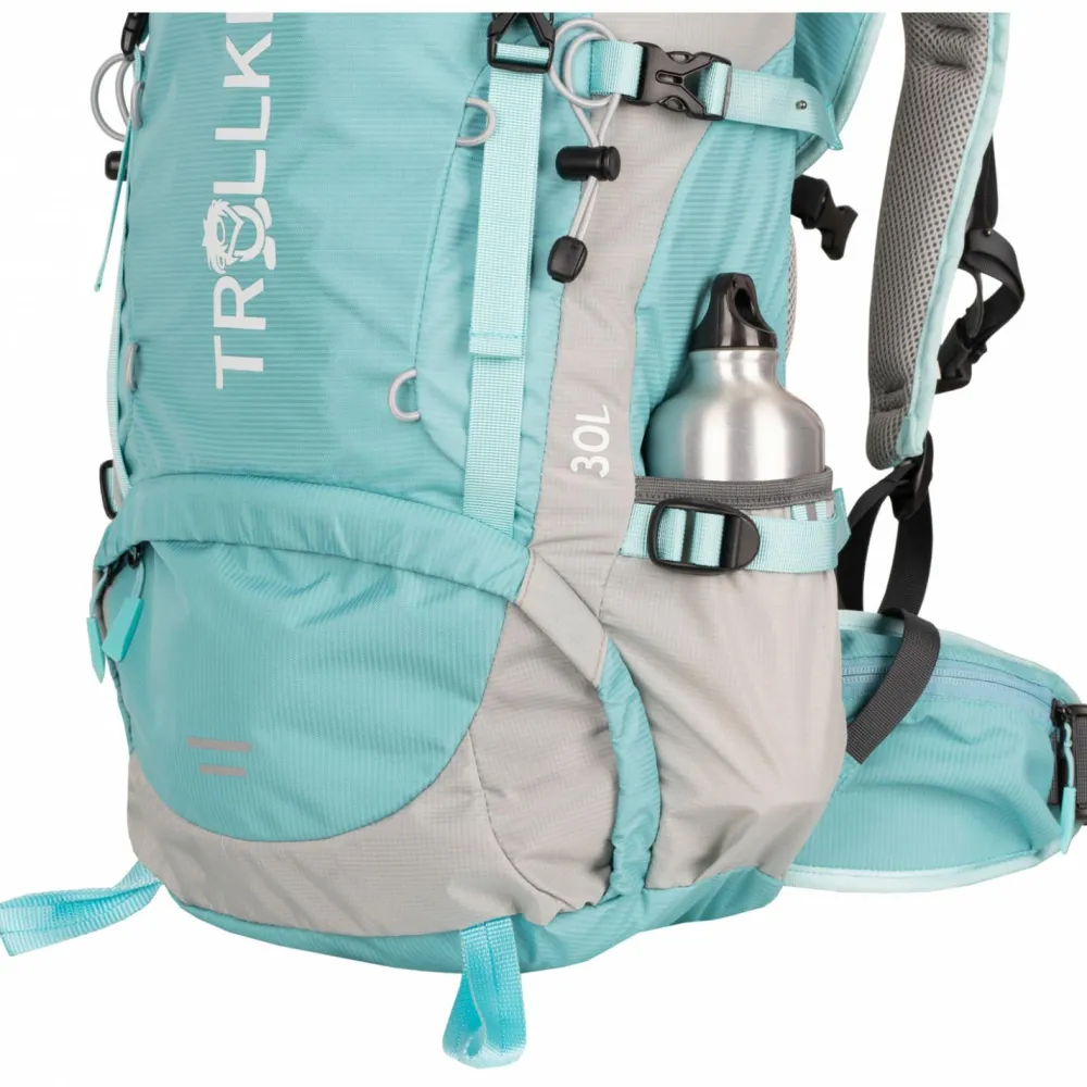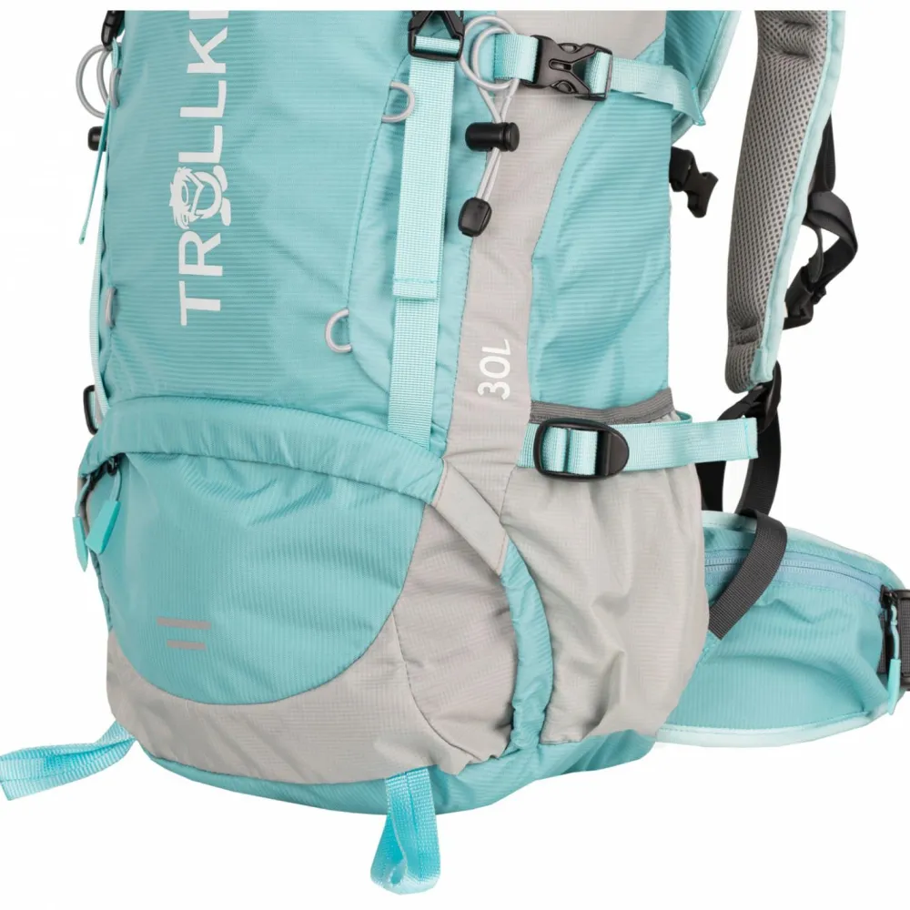 Mit einem Fassungsvermögen von 30 Litern bekommt alles Wichtige unter. Das Material ist strapazierfähigem Polyester gefertigt, das zusätzlich mit einer PU-Beschichtung ausgestattet ist, um den Elementen der Natur entgegentreten zu können. Dank gepolsterten Schulterträgern und gepolstertem Rücken trägt sich der Rucksack angenehm. Dank einstellbarer Rückenlänge und gepolstertem Hüftgurt kann sich das gewicht beim Tragen gleichmäßig verteilen. Das Deckelfach, die Materialschlaufen, die Stockhalterung, die Signalpfeife am Brustgurt und das extra Schlafsackfach machen das praktische und durchdachte Design des Rucksacks komplett.