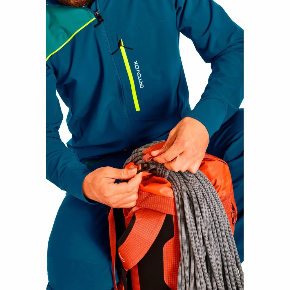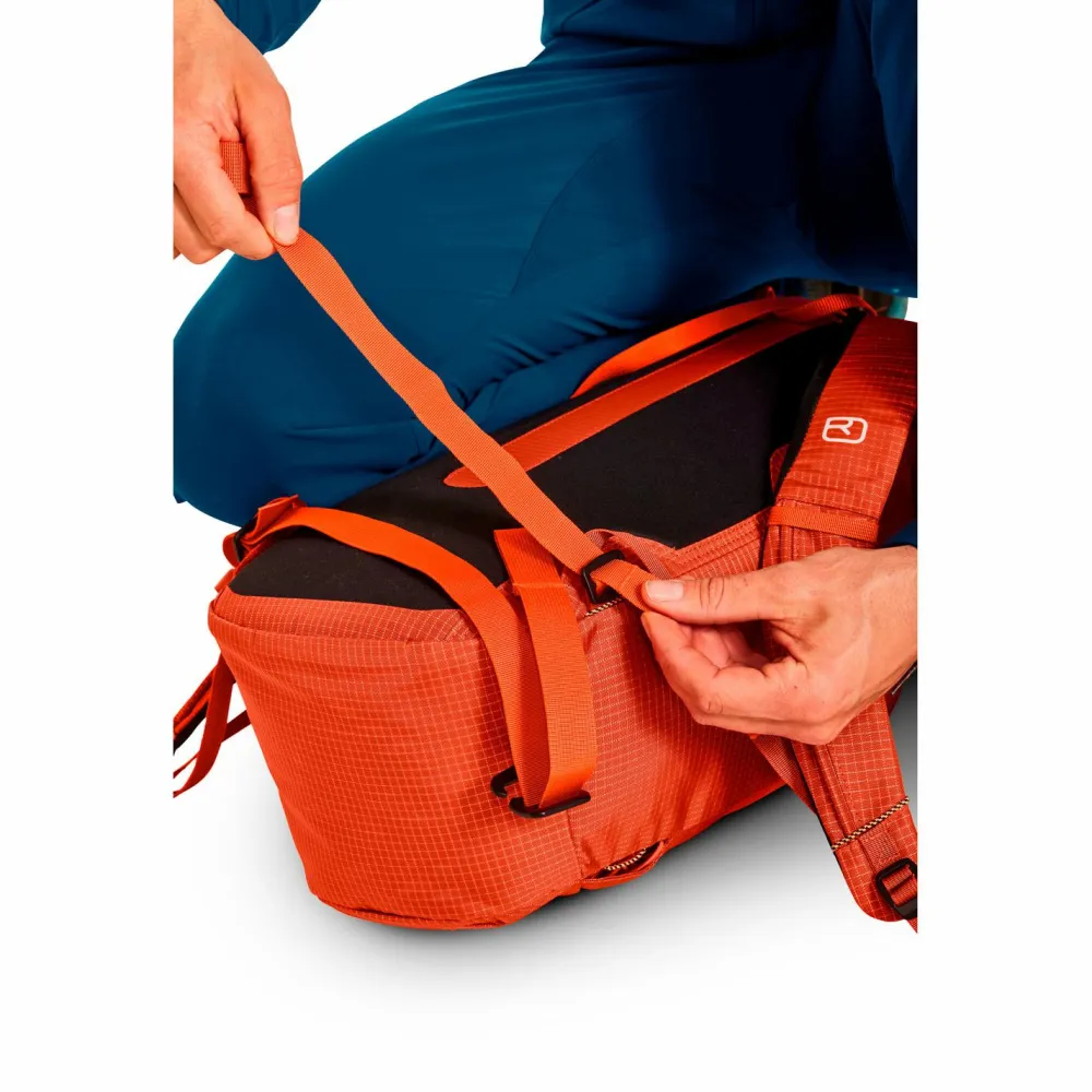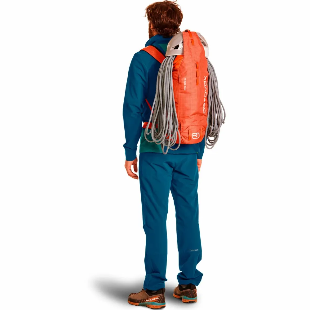 Für lange Touren, wenn es leicht und schnell gehen muss: der Trad Zero 24 Kletterrucksack von Ortovox! Mit nur 570 Gramm ist der alpine Kletterrucksack ein echtes Federgewicht, und dennoch bringt er die Festigkeit und Langlebigkeit für viele raue Felsfahrten mit. Möglich macht es sein robustes 420 D Ripstop-Nylon, das zu 88 Prozent aus recyceltem Material besteht.Anstelle eines Deckelfaches hat der Trad Zero 24 eine leichte, vielseitige und verstaubare Deckel-Lasche, die den Rucksackinhalt schützt und zugleich als Helm- und Seilfixierung fungiert. Besonderen Halt gibt dabei eine Silikonbeschichtung auf der Innenseite, die alles stabil dort hält, wo es sein soll.
