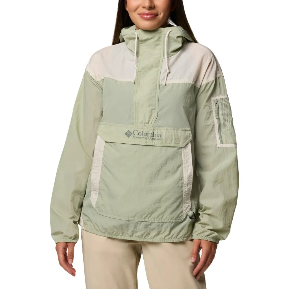 Mit lässigem Design und großer Fronttasche begeistert der Women’s Challenger II Windbreaker von Columbia beim Wandern und in der Freizeit. Dabei ist die Windjacke angenehm windundurchlässig und schützt mit ihrer wasserabweisenden Omni-Shield Behandlung sehr gut bei Regen. Der Windbreaker von Columbia ist mit einer breiten Windabdeckleiste und einer großen Kängurutasche ausgestattet. Unter der frontalen Abdeckleiste ist zusätzlich ein Reißverschluss in halber Länge angebracht. Elastische Bündchen und je ein Kordelzug im Saum und in der Kapuze ergänzen die praktische Windjacke.