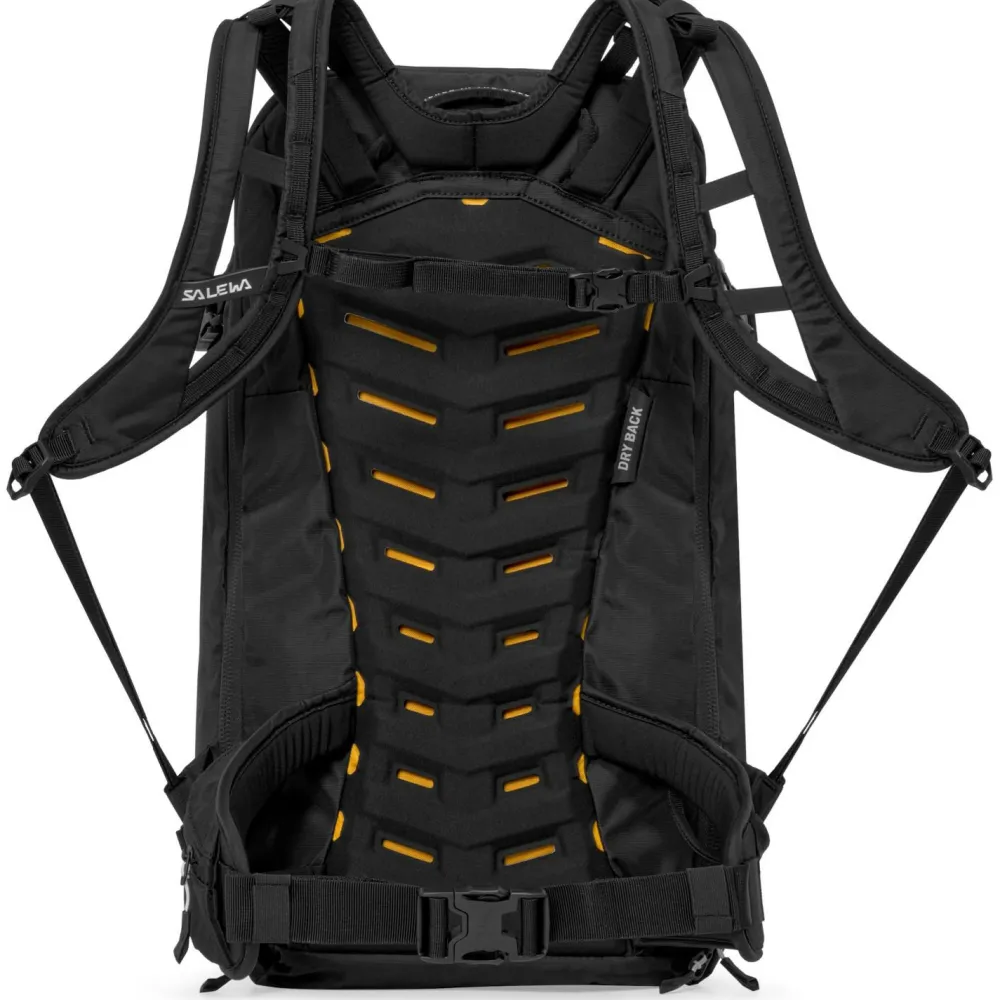 Wenn es bei anspruchsvollen Passagen nur noch ohne Skier weitergeht, können diese schnell am Rucksack befestigt werden. Hierfür sind robuste Straps angebracht. Dank Hüftgurt, Schulterträgern und einem Sternum-Strap kann das Gewicht bei voller Beladung bestens verteilt werden.