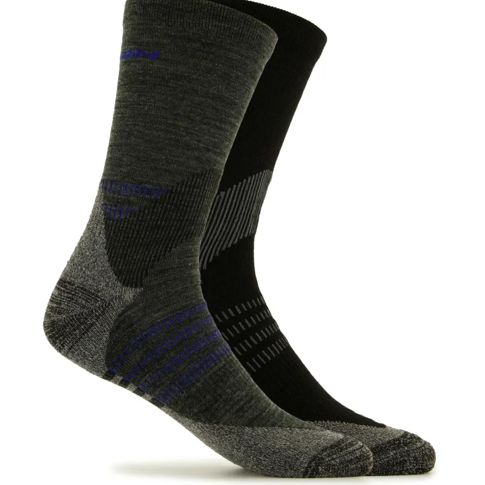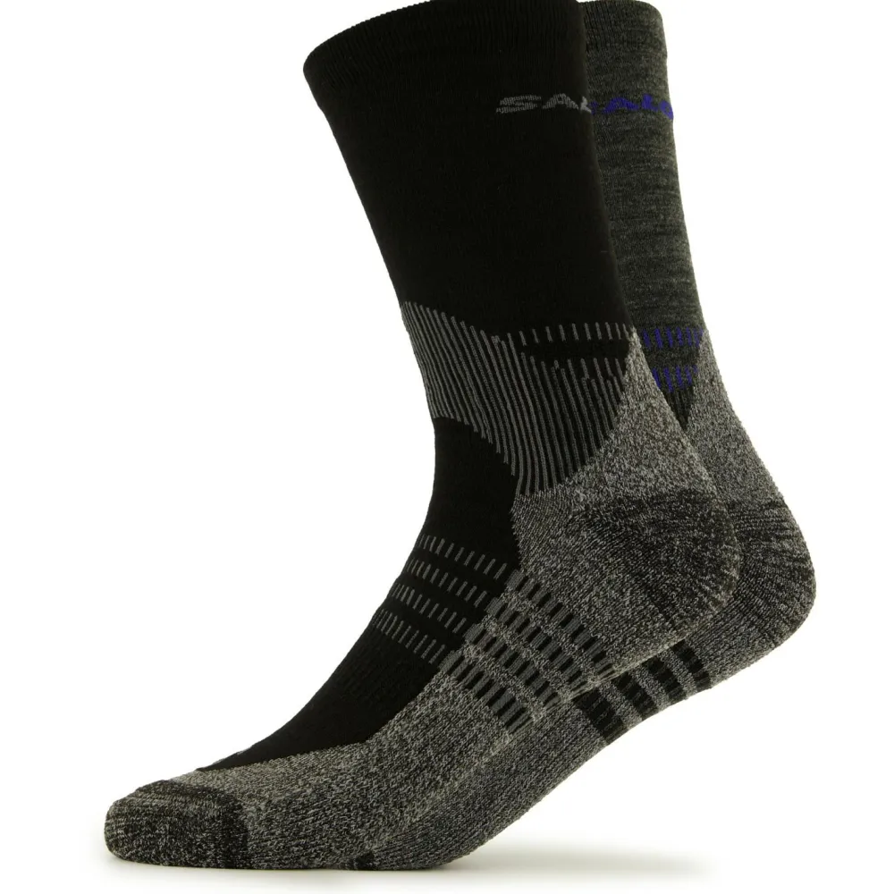 Socken für lange Wanderungen – die X Ultra Access Crew 2-Pack von Salomon. Die langen Wandersocken überzeugen durch einen funktionellen Materialmix aus Merinowolle und Kunstfasern. Durch die Merinowolle wird im Sommer Feuchtigkeit nach außen abgeleitet und im Winter wird die Wärme an den Füßen gehalten. Die gepolsterte Sohle aus einem Kunstfasermaterial bietet Dir angenehme Dämpfung und sorgt für ein tolles Tragegefühl. Durch die Auslegung als lange Wandersocken tragen sich die X Ultra Access Crew 2-Pack von Salomon auch in hohen Wanderschuhen sehr bequem.
