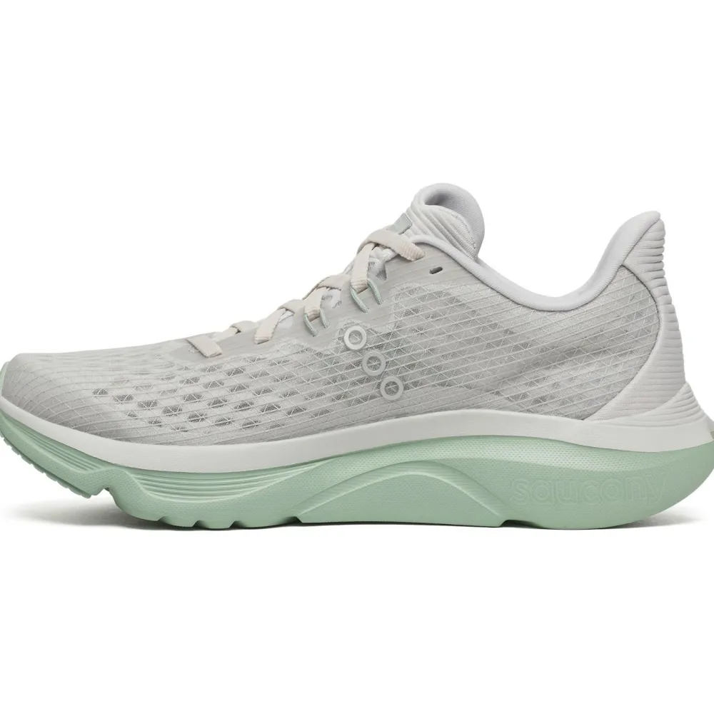 Der Women’s Kinvara 16 ist ein echtes Leichtgewicht: Rund 360 Gramm pro Paar machen ihn zum idealen Partner für schnelle Einheiten oder längere Strecken. Das atmungsaktive Obermaterial sorgt dafür, dass Deine Füße frisch bleiben – selbst wenn das Training mal schweißtreibend wird. Die herausnehmbare Synthetik-Einlegesohle lässt sich unkompliziert gegen eigene Einlagen tauschen, falls Du besondere Ansprüche hast. Durch die klassische Schnürung sitzt der Schuh passgenau am Fuß und gibt Dir das sichere Gefühl, das man auf dem Weg zu neuen Bestzeiten braucht. Hier zeigt sich Sauconys Erfahrung als Traditionsmarke in jedem Detail.