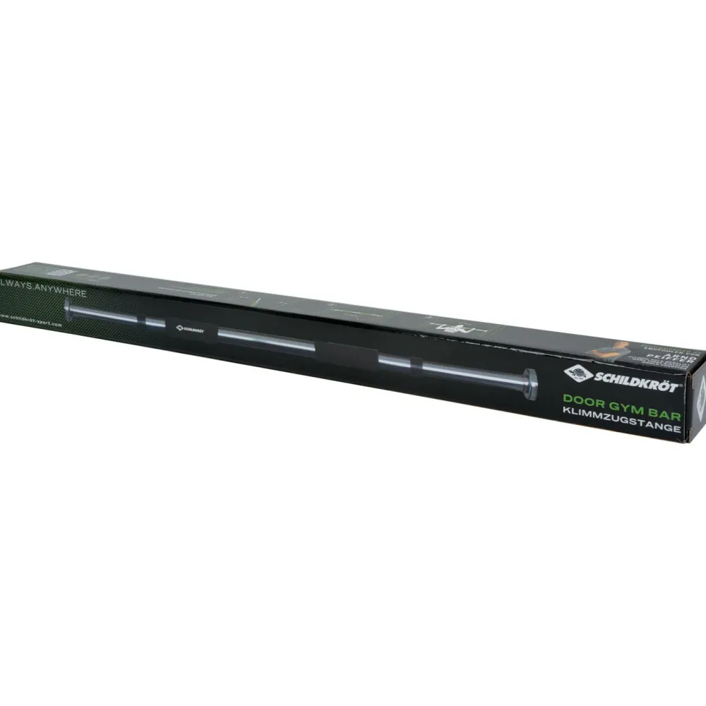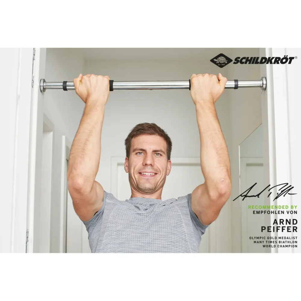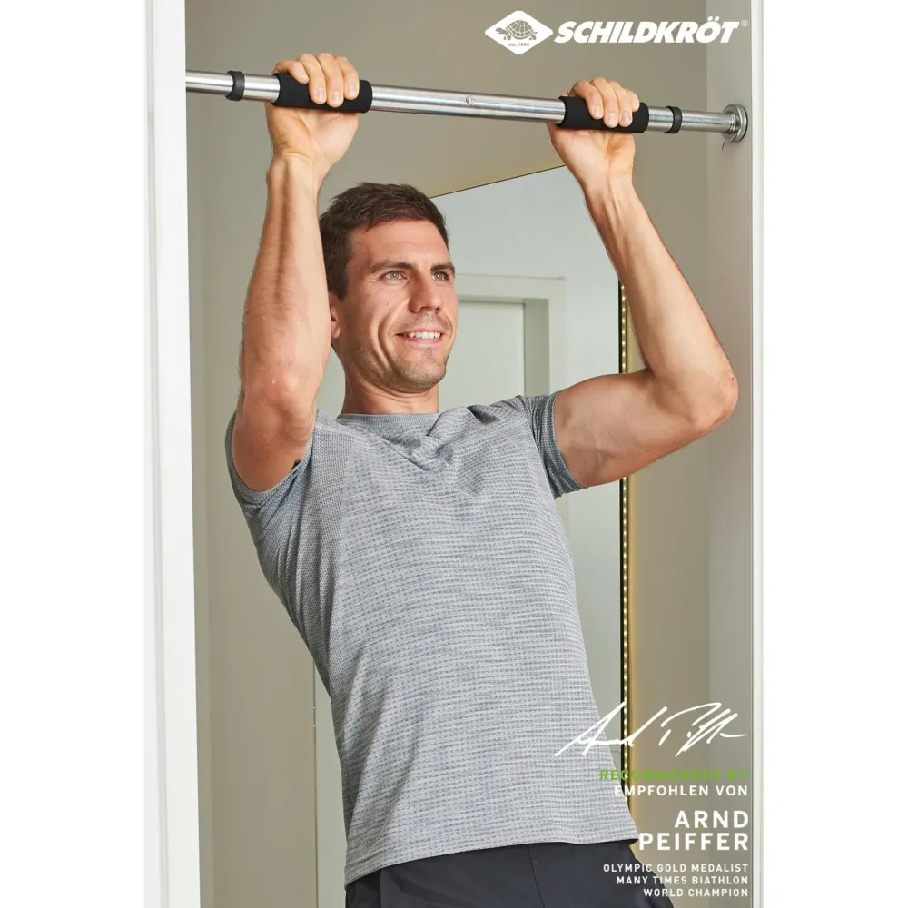 Die Türreck Stange Klimmzugstange von Schildkröt Fitness kannst Du in jeden Türrahmen aufbauen. Mit ihrer verstellbaren Länge von 63 – 96 cm ist sie flexibel einsetzbar und Du kannst sie problemlos mit in den Urlaub nehmen. Die seitlichen Gummiauflagen schonen den Türrahmen und die Schaumstoffgriffe Deine Handflächen.
