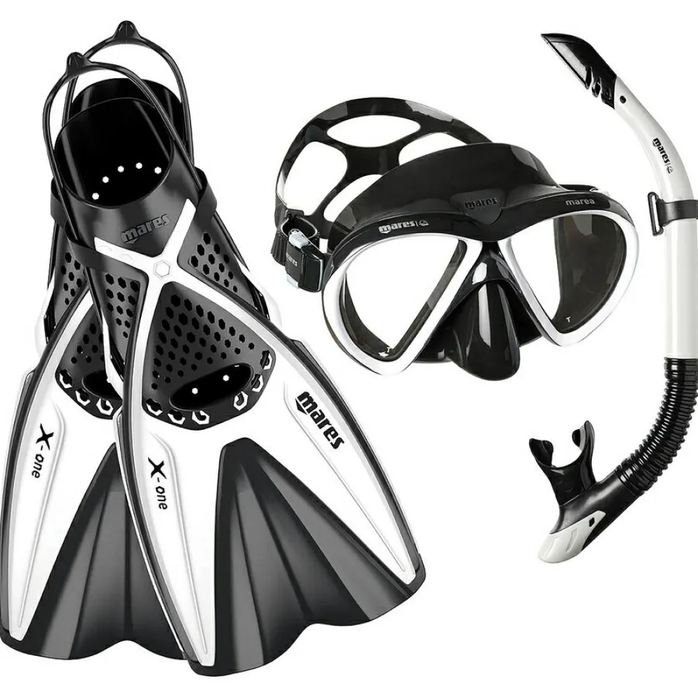 Das Schnorchelset Set X-One Marea von Mares ist praktisch für Urlaub und Hallenbad! Der Schlauch ist robust und geriffelt, während das Mundstück aus weichem Silikon besteht, um den Komfort im Wasser zu erhöhen. Das verschiebbare Schnorchelhaltersystem ermöglicht eine einfache Verwendung des Schnorchels. Die Brille überzeugt mit einem ergonomischen Sitz und einem weiten Bereich der Unterwassersicht. Die Flossen lassen sich einfach verstellen. Ideal für den Wassersport!
