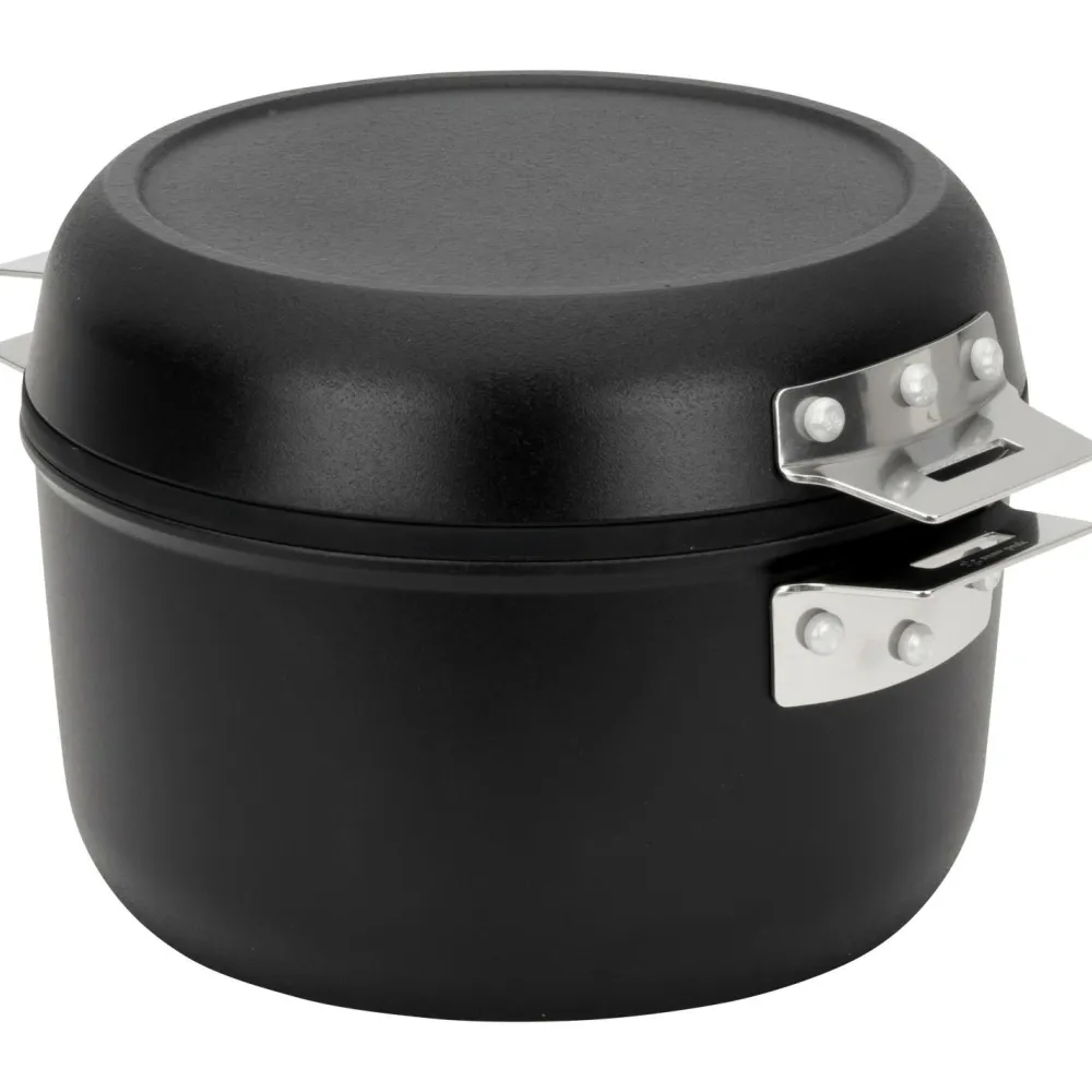 Ob zuhause oder beim Camping – das Home & Camp Cooker von Snow Peak lässt sich optimal auf Deine Kochbedürfnisse anpassen! Das zweiteilige Kochset aus Aluminium besteht aus einem Topf und einer Bratpfanne, die bei Bedarf kinderleicht zu einem Suppentopf oder einem Dutch Oven kombiniert werden können. Hinzu kommt ein praktischer Glasdeckel, sodass Du das Essen immer perfekt im Blick hast. Zum Verstauen und Transportieren können der Topf und die Pfanne platzsparend ineinander gelagert werden.