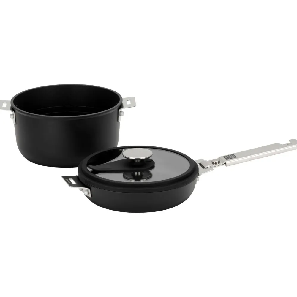 - Topf (2,5 L); Bratpfanne (0,9 L); Glasdeckel; abnehmbarer Griff