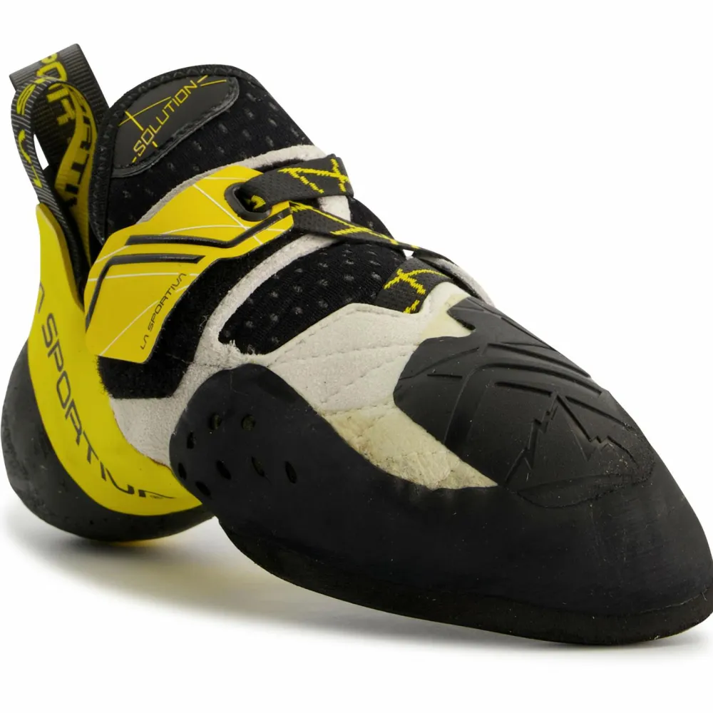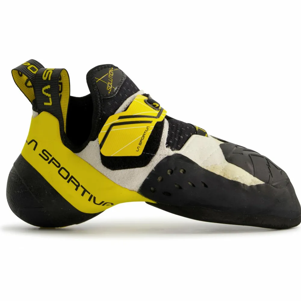 Die La Sportiva Solution haben eine starke Vorspannung, die dank des bewährten P3-Systems (Permanent Power Platform) sehr langlebig ist. Außerdem zeichnen sich die Schuhe durch einen aggressiven Downturn und eine mittlere Asymmetrie aus. Dadurch ermöglichen sie eine hervorragende Kraftübertragung auf die Zehen. Sie eignen sich daher besonders für steile, überhängende Routen, schmale Leisten und kleine Tritte.