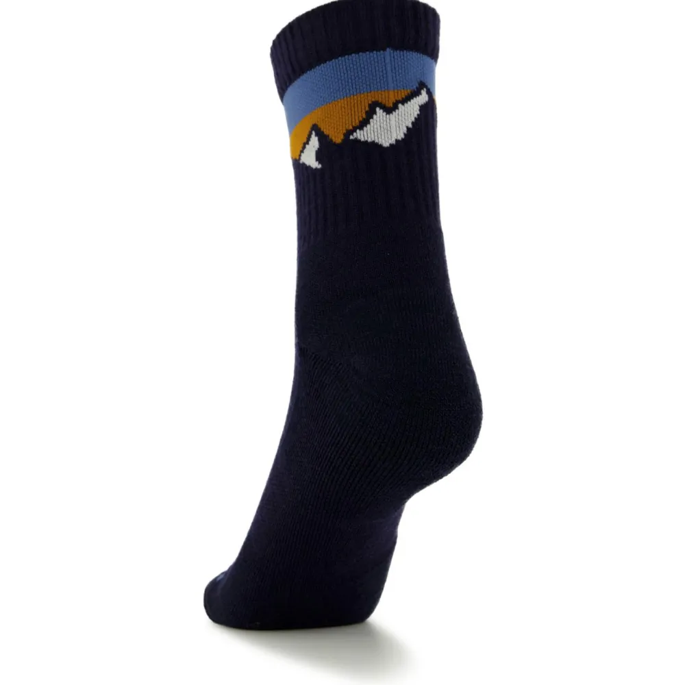 Die Merino Quarter Tech Rib Mountains Socks von Stoic überzeugen mit einem funktionalen Materialmix: Der hohe Anteil an Merinowolle hemmt Gerüche, kratzt nicht auf der Haut und ist angenehm atmungsaktiv. In Kombination mit schnelltrocknenden, langlebigen Kunstfasern erhältst Du strapazierfähige Wandersocken mit hohem Tragekomfort, welche Dich beim Wandern und Reisen begleiten werden. Die bunte Bergsilhouette am Schaft sorgt für ein optisches Highlight und sorgt für einen modischen Outdoorlook, der auch im Alltag überzeugen kann.