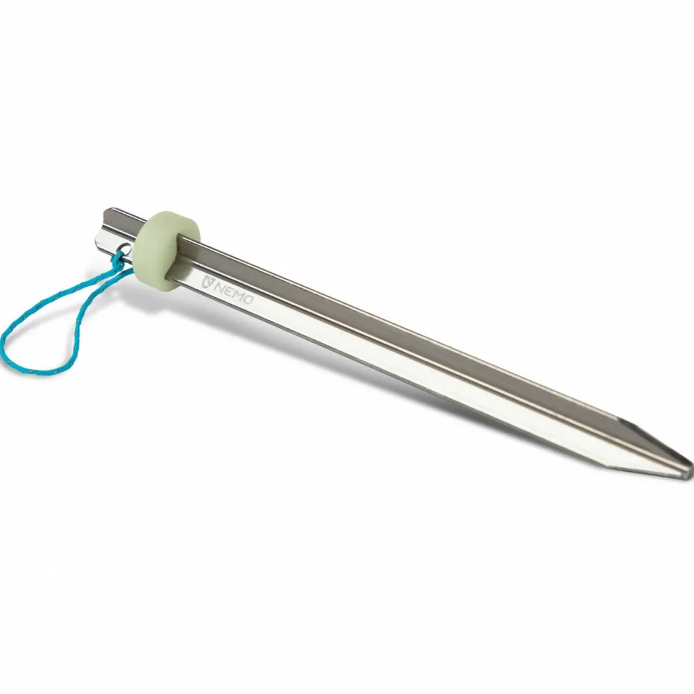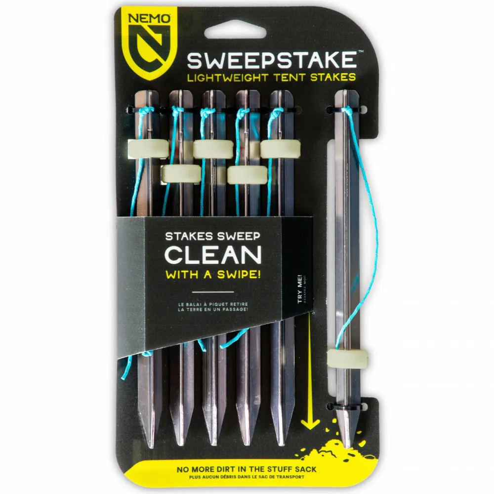 Die leichten Sweepstake Heringe von Nemo sind aus hochwertigem 7000 Aluminium gefertigt und bieten mit 18 cm Länge vielseitige Einsatzmöglichkeiten. Durch ihre spezielle Form und den integrierten Schaber, wird der Schmutz mit einer Handbewegung vom Hering entfernt, und der Dreck landet nicht im Rucksack oder in der Zelttasche.