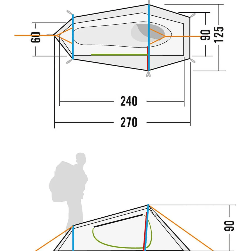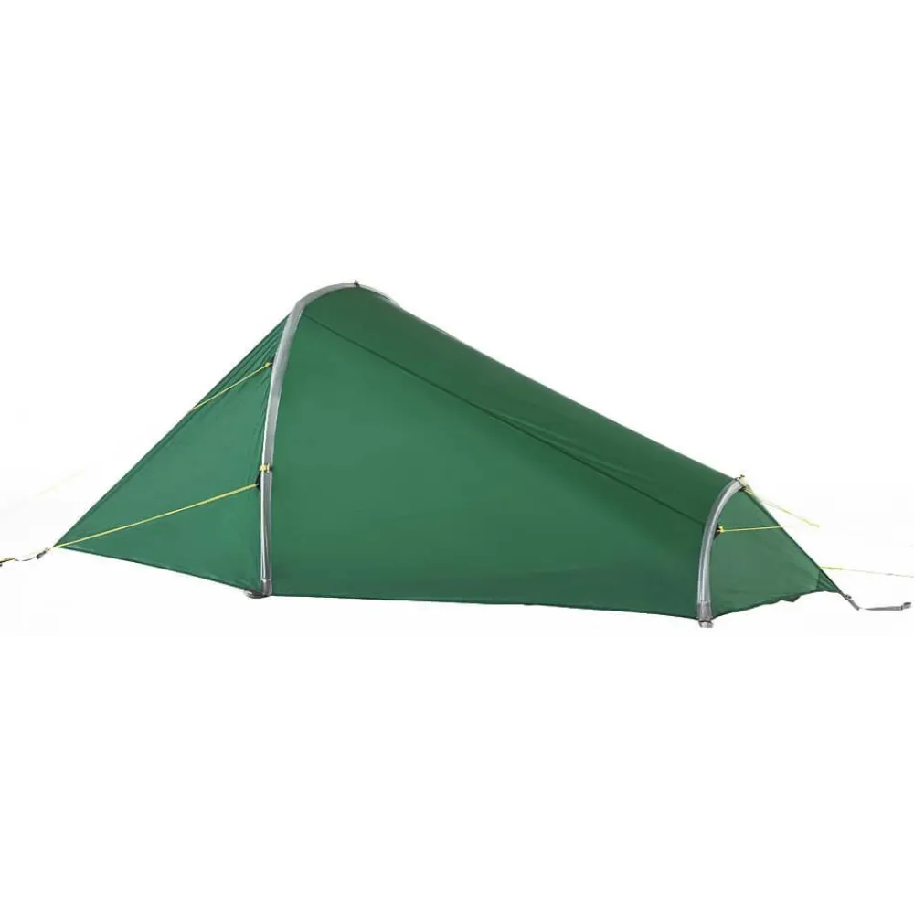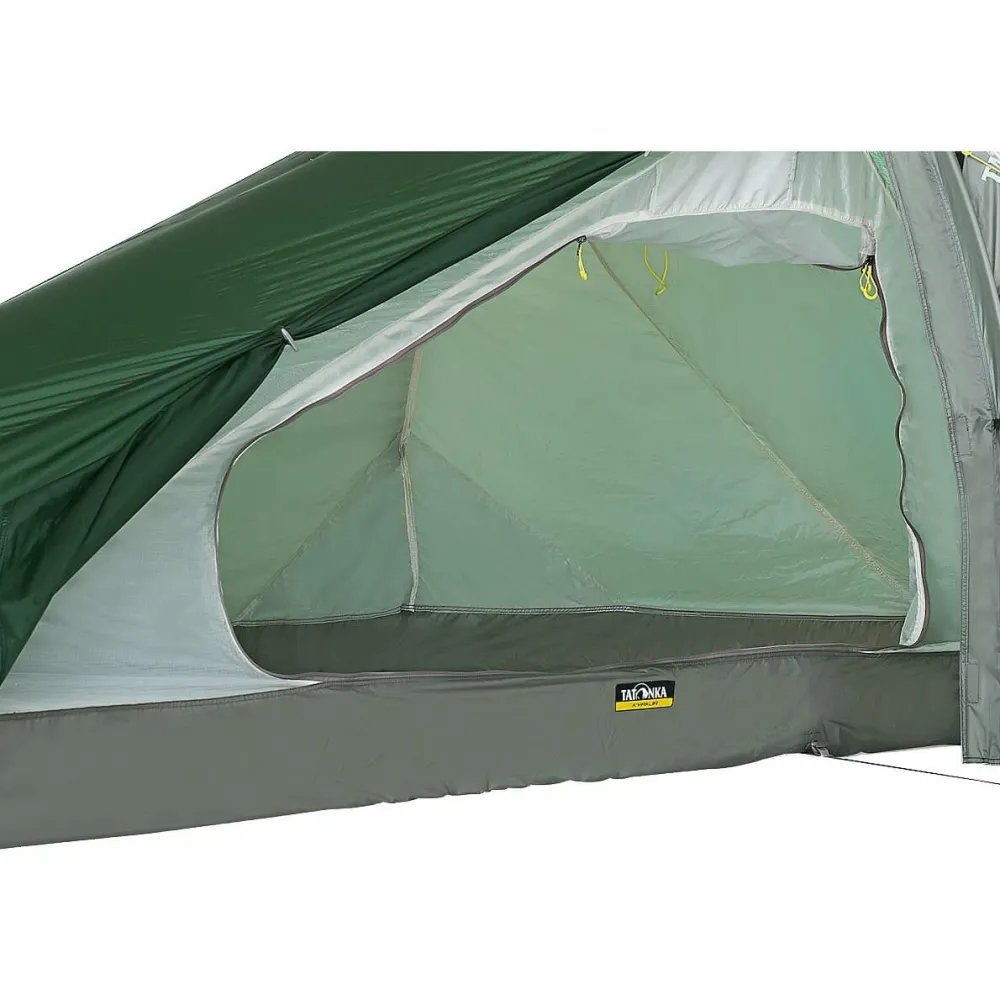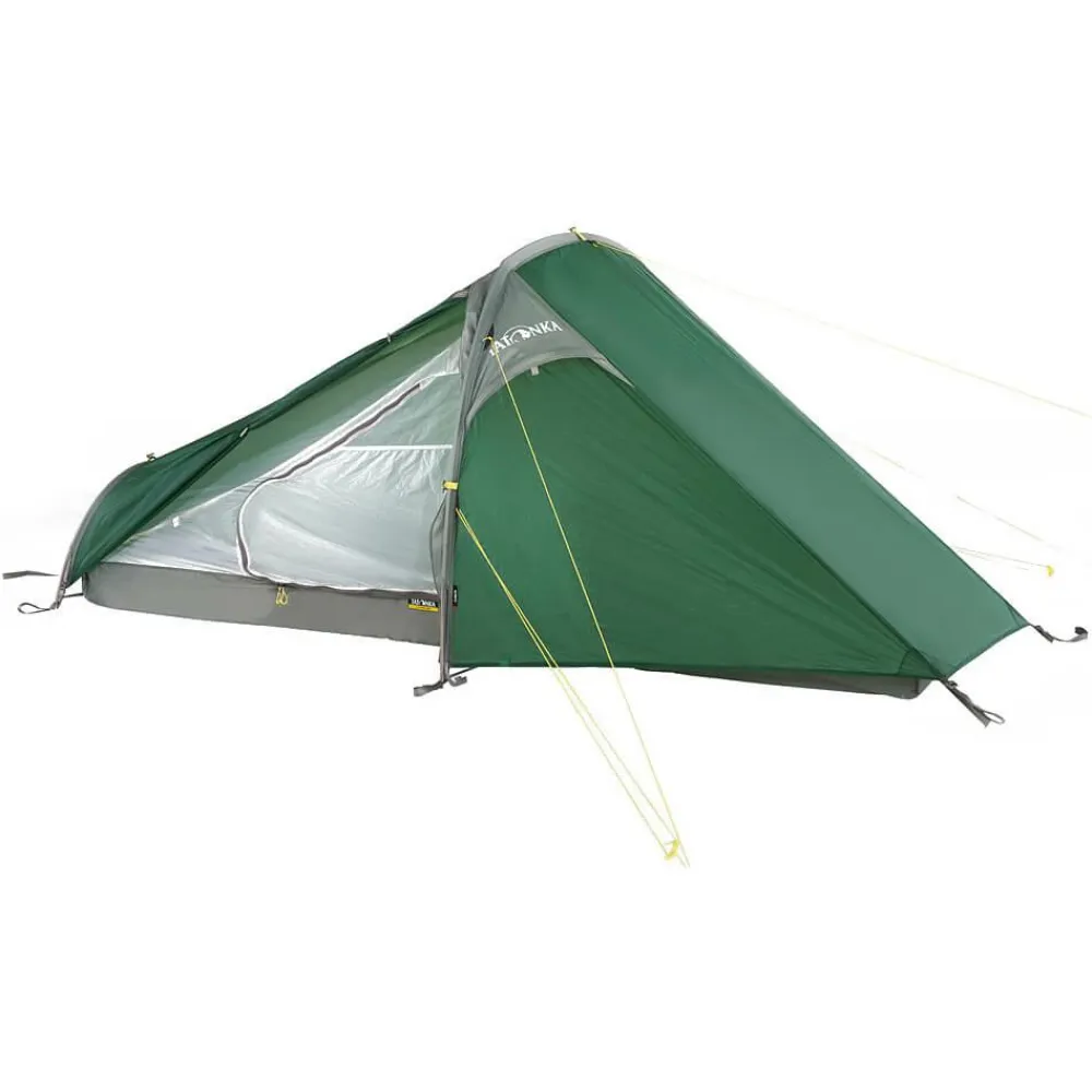 Das Kyrkja 1 Personenzelt von Tatonka ist eine sehr leichte und klein packbare Camping- und Trekking-Solotouren-Unterkunft. Das Tunnelzelt mit Seiteneingang und Apside hat einen zweiten Gestängebogen, der es auch langen Outdoorern ermöglicht, ausgestreckt zu schlafen. Das Kyrkja ist mit seinem ultraleichten Scandium Gestänge schnell und einfach aufgebaut, da Innen- und Außenzelt miteinander gekoppelt sind. Verstärkte Eckpunkte mit Gurtbandschlaufen sorgen dabei für Stabilität und Haltbarkeit. Sollte es beim Abbau regnen, lässt sich das Innenzelt auch aushängen und trocken verstauen. Beim nächsten Aufbau wird dann zunächst das Außenzelt aufgestellt und anschließend das trockene Innenzelt eingehängt.Für angenehm trockenes Innenklima sorgt das Außenzelt aus äußerst reißfestem, 5-fach silikonbeschichtetem Nylon 6.6 Ripstop-Gewebe. Der wasserdichte Zeltboden aus PU-beschichtetem Nylon schützt mit einer Wassersäule von 10.000 mm optimal vor Nässe von unten. Das Innenzelt sorgt mit einem Lüfter für ausreichend Ventilation. Da die Apsis genug Platz für den Trekkingrucksack und andere Ausrüstung bietet, kann man es sich drinnen durchaus gemütlich machen. Die integrierte Wäscheleine im Innenraum sorgt für trockene Socken und hilft beim Ordnung halten. Wer Gewicht und Packmaß minimal halten will, ohne auf verlässliche Robustheit zu verzichten, ist mit dem Kyrkja 1 Personen Zelt von Tatonka bestens versorgt!