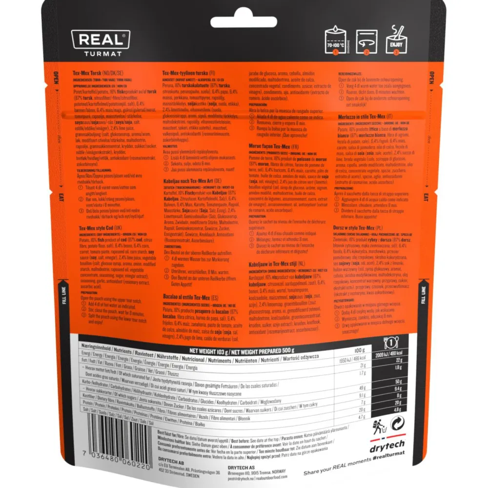 Real Turmat Tex-Mex Cod vereint den frischen Geschmack arktischen Kabeljaus mit einem Tex-Mex-Twist. Dies sorgt für ein einzigartiges und schmackhaftes Erlebnis unterwegs. Dieses Gericht wird aus frischem Kabeljau aus Norwegens renommierter Skrei-Fischerei hergestellt, die nur von Januar bis März verfügbar ist. Der Kabeljau wird mit Kartoffeln, Karotten und einer aufregenden Mischung aus Tex-Mex-inspirierten Zutaten wie Mais, Paprika, Chili, Knoblauch, Kreuzkümmel und Bohnen kombiniert. Jeder Bissen bietet eine köstliche Fusion norwegischer Traditionen und lebhafter Tex-Mex-Aromen, perfekt für Outdoor-Enthusiasten, Wanderer und Camper, die etwas Neues ausprobieren möchten.