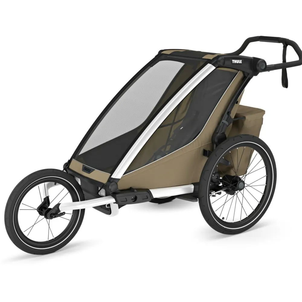 Viele Möglichkeiten und viel Platz für GepäckNeben den kleinen Passagieren findet auch das Gepäck seinen Platz. Eine geräumige hintere Gepäcktasche nimmt alles auf, was man unterwegs braucht. Die Tasche kann für mehr Beinfreiheit auch abgenommen und verstaut werden, wenn der Thule Chariot Cross 2 für eine Joggingrunde genutzt wird. Den Wechsel zwischen Radanhänger und Spaziergänger oder Jogger vollzieht man dank des im Lieferumfang enthaltenen Buggy-Sets schnell und einfach. Die beiden Systeme Thule Click n’ Store und Thule VersaWing machen das Ganze zu einer Sache von wenigen Handgriffen. Zudem ist der ergonomische Schiebebügel für den „Buggy Modus“ verstellbar, sodass er sich beim Gehen oder Joggen in optimaler Greifposition befindet.
