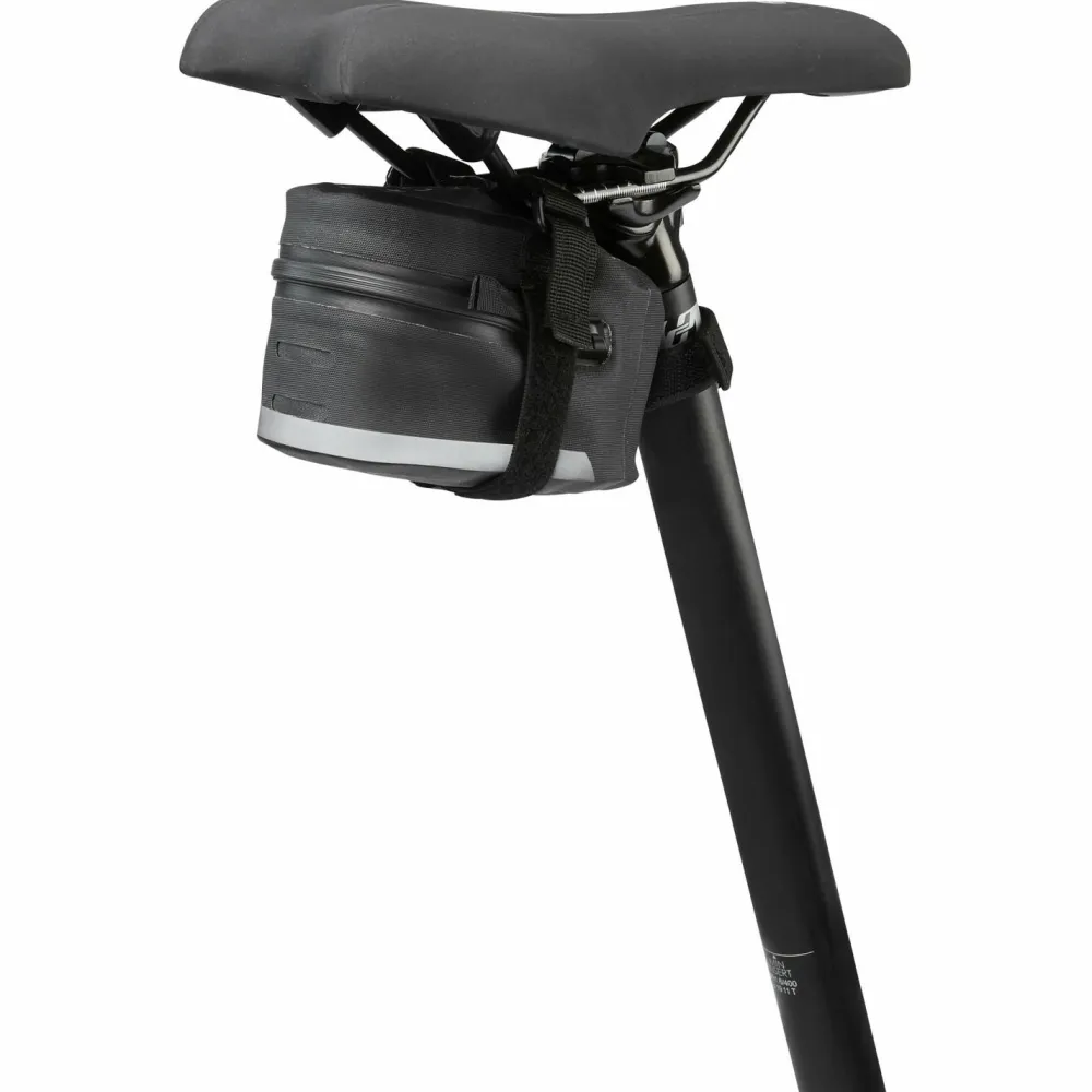 Mit dem Klettverschluss lässt sich die wasserdichte Tasche am Sattel befestigen. Sie ist formstabil und widerstandsfähig. Ein Rücklicht lässt sich jederzeit an der Tasche befestigen. Ideal um das Nötigste mitzunehmen.