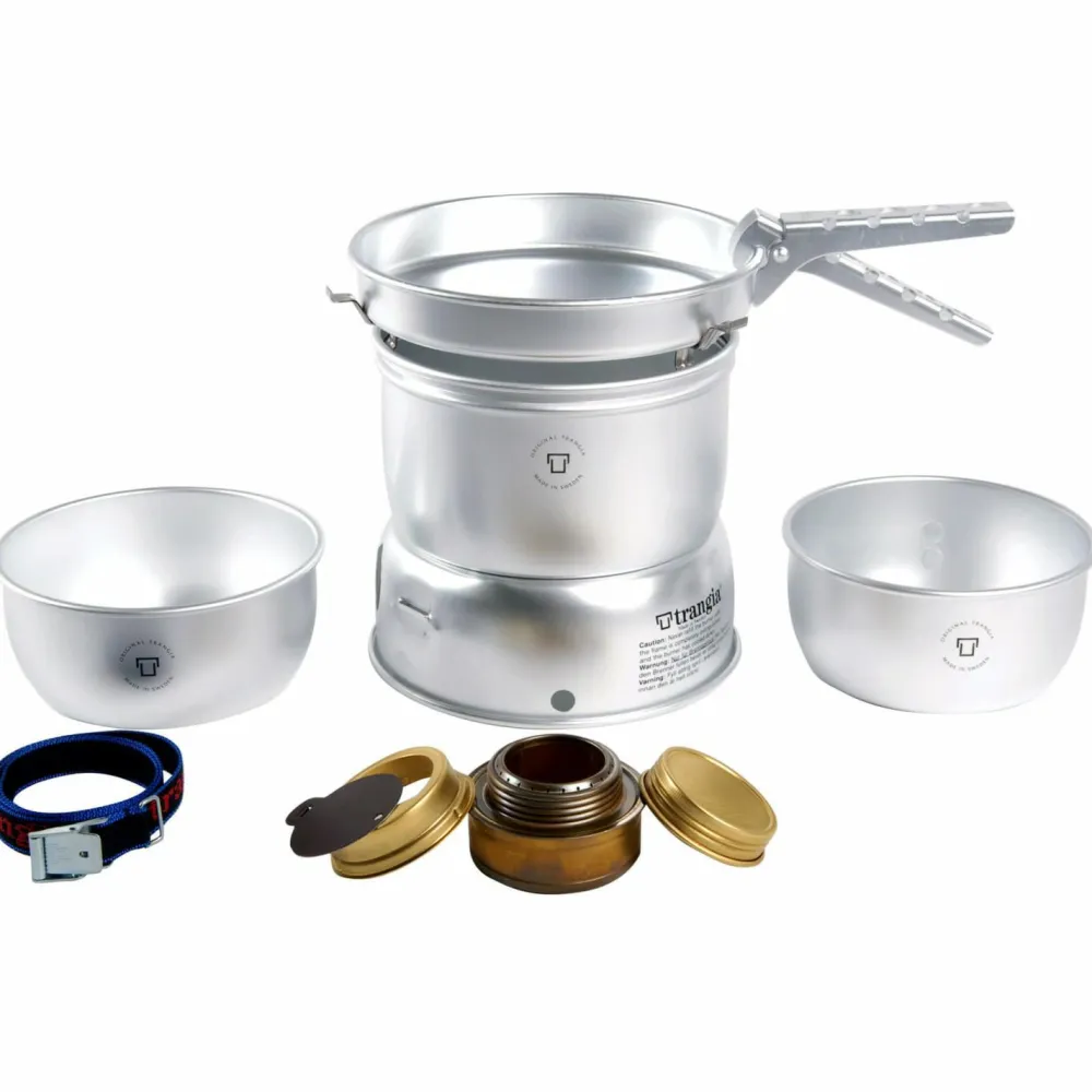 Die Kocherserie 27 Ultralight von Trangia umfaßt Kocher zum Bekochen von ein oder zwei Personen. Die Sets dieser kompakten Kocher fordern nur minimalen Platz im Rucksack und sind somit ideal für Touren, bei denen jedes Gramm zählt. Zudem ist es möglich, bei hochgeklappten Halterungen im oberen Windschutz, auch einen größeren Kochtopf zu verwenden. Die Sets gibt es außerdem in zwei Varianten: Ultralight Aluminium und Ultralight Hardanodized Aluminium.Der Trangia 27-1 besteht aus zwei 1 Liter Töpfen (einer mit und einer ohne Maßeinteilung), einer Bratpfanne (Ø 18 cm), oberem und unterem Windschutz, Spiritusbrenner, Zange und Riemen. Den Trangia 27-1 gibt’s auch mit einem Primus Gasbrenner anstatt des Spiritusbrenners!Die Variante Ultralight wird aus einer neuen Aluminiumlegierung hergestellt, die zu 50% stärker ist, als herkömmliches Aluminium. Das erlaubt den Bau von dünnwandigeren und damit leichteren Gefäßen. Deshalb punkten die neuen Trangia Modelle mit einem Gewichtsvorteil von bis zu 25% im Vergleich zu ihren Vorgängern!Ultralight Hardanodized ist eine ausgesprochen verschleißfeste Aluminiumlegierung. Durch Hartanodisierung erhöht sich die Kratz- und Verschleißfestigkeit, sowie die Korrossionsbeständigkeit. Diese Oberflächenbehandlung erleichtert zudem die Reinigung der Gefäße! Aufgrund seiner hervorragenden Eigenschaften ersetzt dieses Material sowohl die Titanium-, als auch die Duossal-Kocher.