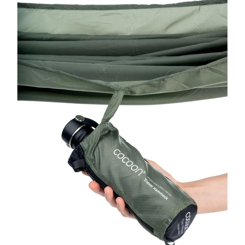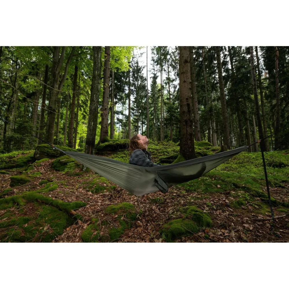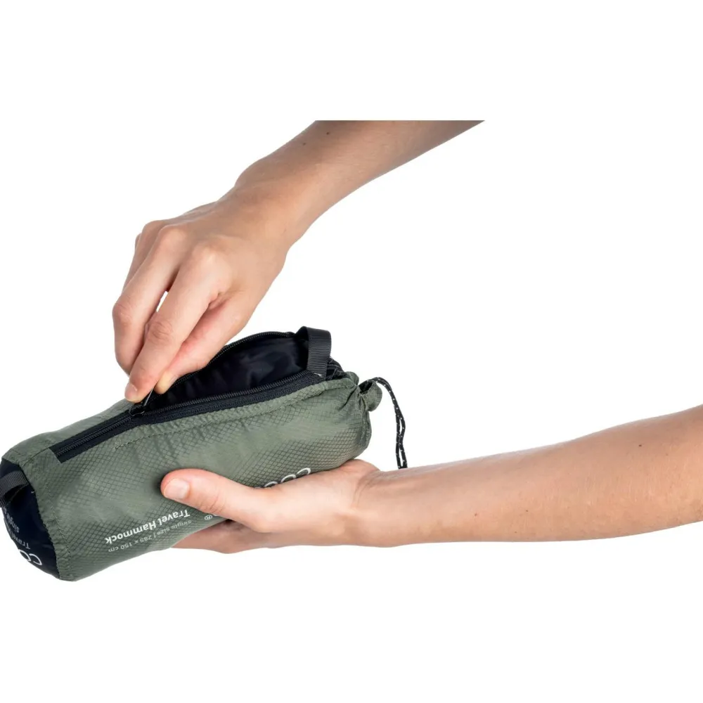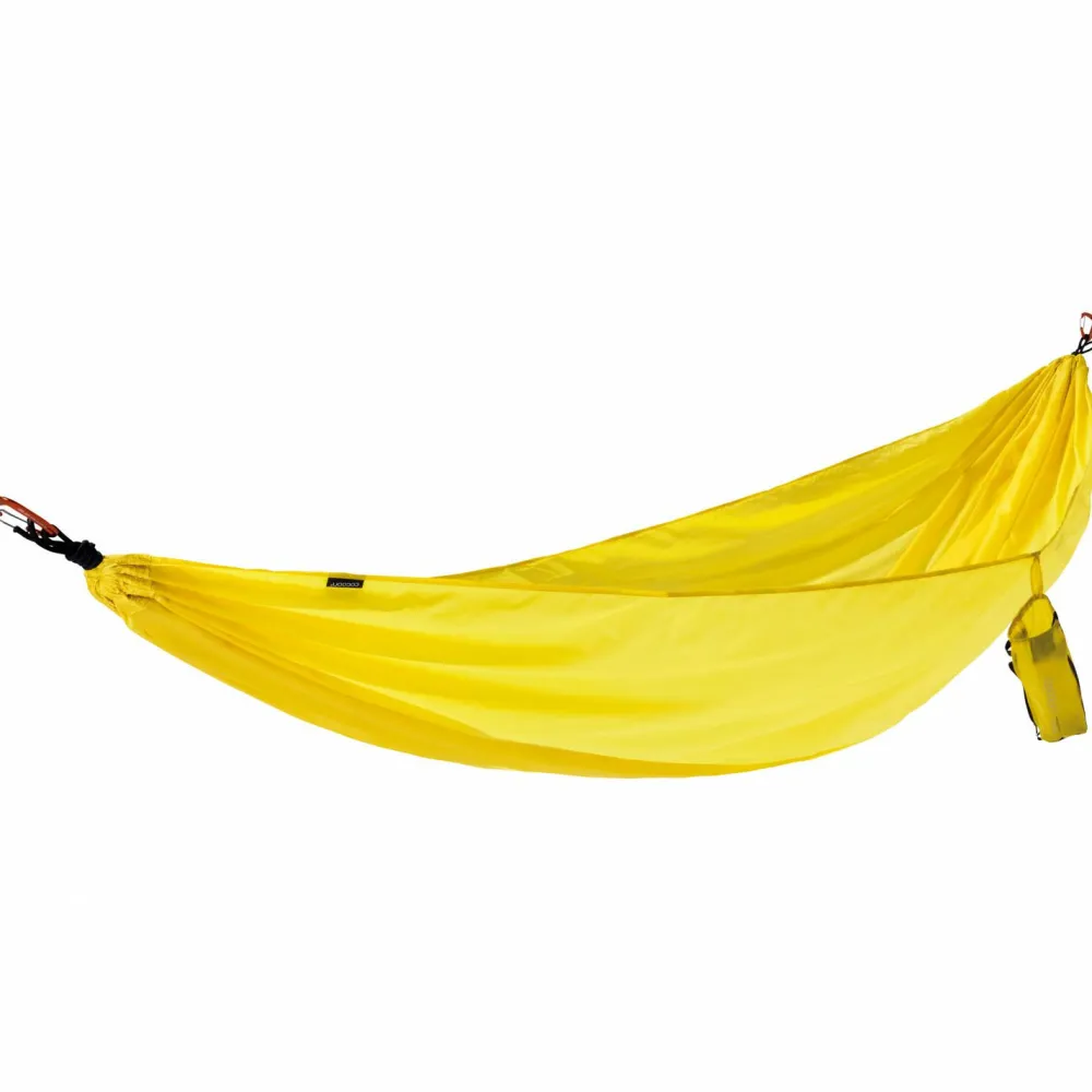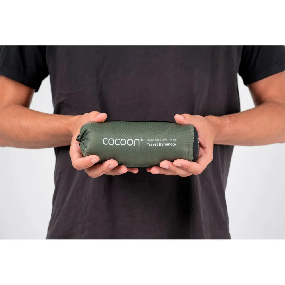 Allein gemütlich abhängen und genießen: Die Travel Hammock Single Hängematte von Cocoon überzeugt mit durchdachten Details und großzügigen Dimensionen für einen rundum erholsamen Liegekomfort. Weiches und gleichzeitig starkes 70 Denier Diamond Ripstop Nylon macht das gute Stück bequem und robust. Superstarke Vierfachnähte halten was aus und der praktische Packsack sorgt dafür, dass sich die Hängematte im Gepäck schön klein macht. Zwei Aluminium-Karabiner sind im Lieferumfang enthalten.