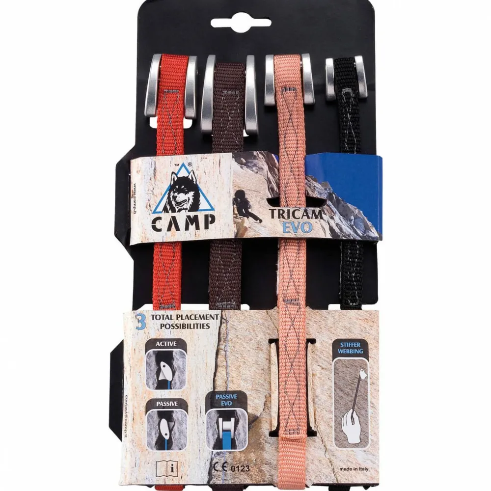 Vielseitige Platzierungsmöglichkeiten beim Bergsteigen, Alpinklettern und Trad-Climbing – der Tricam Evo von Camp! Im Gegensatz zum Standard-Tricam, wie er seit den 1970ern unverändert im Einsatz ist, bietet der Evo eine zusätzliche Klemmposition. Bisher ließen sich Tricams wahlweise aktiv, unter Ausnutzung des Drehmoments, legen oder quer in Risse gelegt als Klemmkeil nutzen. Der Tricam Evo verjüngt sich auch in der Längsseite nach unten zu und lässt sich dadurch auch längs in Rissen als Klemmkeil nutzen. Dadurch deckt eine einzige Größe mehr Breiten ab als beim normalen Tricam.