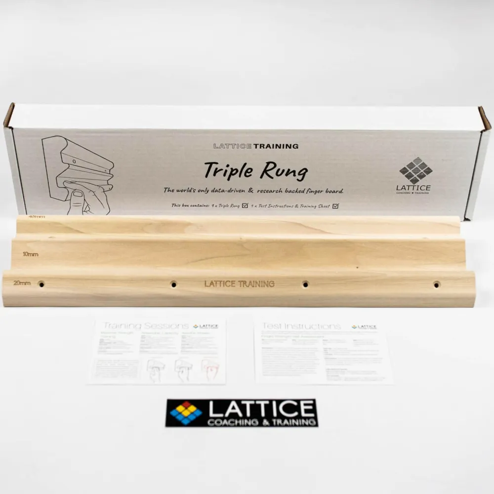 Die obere Kante ist 45 mm breit und eignet sich am besten zum Aufwärmen der Hände und Finger. Die mittlere Kante hat eine Tiefe von 20 mm und die untere Kante eine Tiefe von 10 mm. So kann der Schwierigkeitsgrad jeweils variiert werden.Im Lieferumfang des Boards sind Einzelheiten zur Durchführung eines Fingerkrafttests enthalten. Das Ergebnis des Tests kann dann an Lattice gesendet werden, damit ein benutzerdefinierter Bericht erstellt wird, der eine Einschätzung der eigenen Stärke liefert, um noch gezielter zu trainieren und sich mit anderen messen zu können. Da bleibt man motiviert!