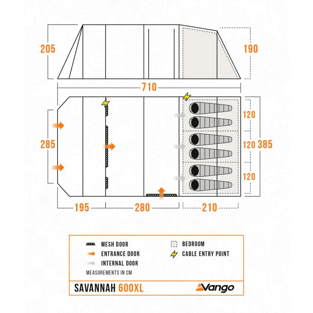 Das Savannah 600XL-6-Personen-Zelt-Package von Vango bietet Dir und Deiner Familie großzügigen Platz und Komfort für jedes Campingabenteuer. Es verfügt außerdem über ein vollständig geschlossenes, integriertes Vorzelt, das unter allen Bedingungen gut nutzbar ist und den Wohnraum deutlich erweitert. Der vollständig eingenähte Zeltboden schützt vor Zugluft und Ungeziefer, während die Belüftung über die Netztüren und die AirZone Paneele gesteuert werden kann. Mit einer Höhe von über 2 Metern ist das Zelt leicht aufzustellen und zu bewegen. Die große Vordertür kann bis zur Mitte oder ganz geöffnet werden, was Dir eine Vielzahl von Optionen für unterschiedliche Bedingungen und Verwendungszwecke bietet.