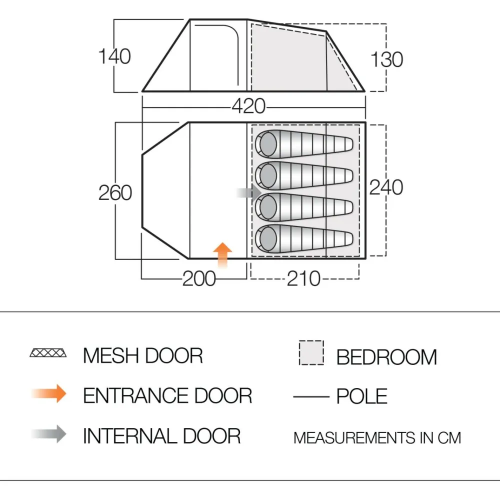 Für ein angenehmes Raumklima sorgen Belüftungsöffnungen. Dank Moskitonetzen kannst Du gut lüften, ohne dass Insekten eindringen. Im Vorraum lässt sich Equipment lagern, ohne dass es Platz im Schlafraum wegnimmt. Ein Allrounder für Camper, das Skye 400!