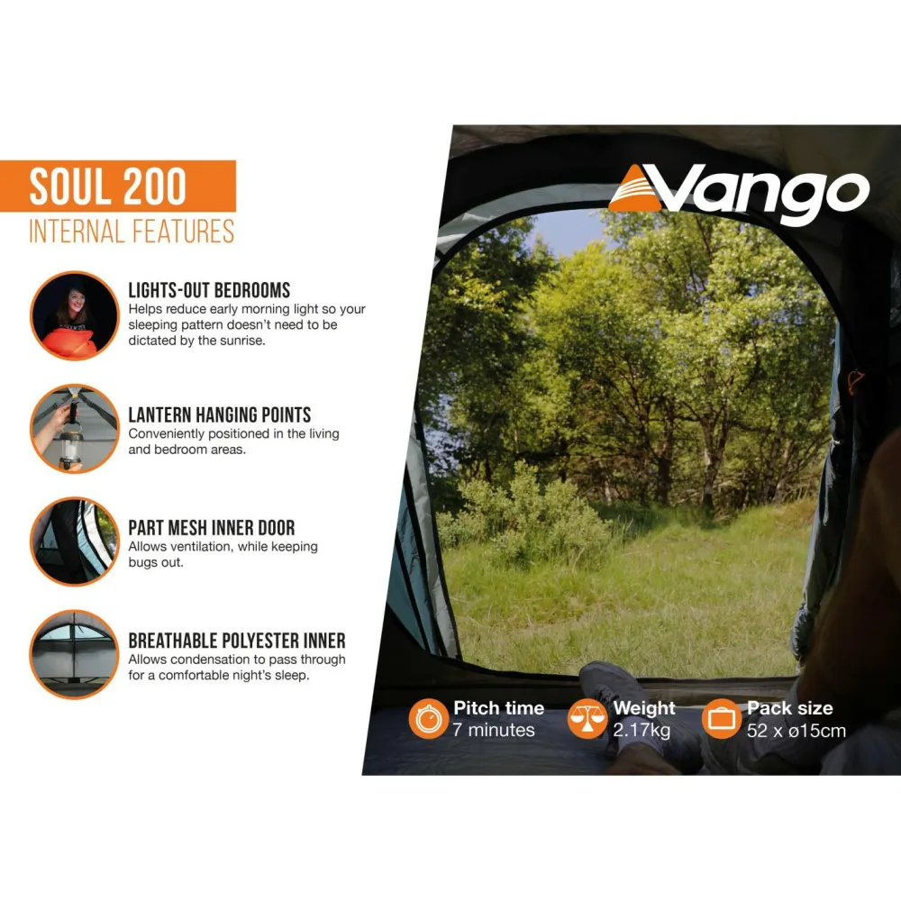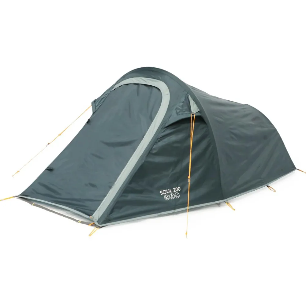 Wer zu Zweit unterwegs ist, der ist mit dem 2-Personen-Zelt Soul 200 von Vango gut ausgestattet! Die Konstruktion lässt sich einfach und schnell alleine aufbauen. Dabei wird das Mesh-Innenzelt zuerst aufgebaut. Abspannleinen sichern es bei Wind und Wetter. Das Zelt kommt mit wind- und wasserdichtem Vango ProTex daher, das Dich zuverlässig vor widrigen Bedingungen schützt. Zudem ist das Material flammhemmend.