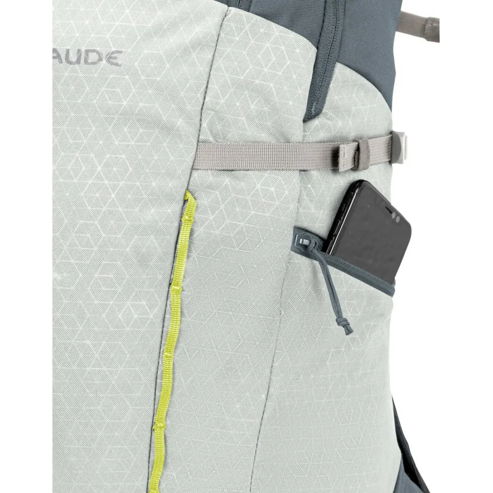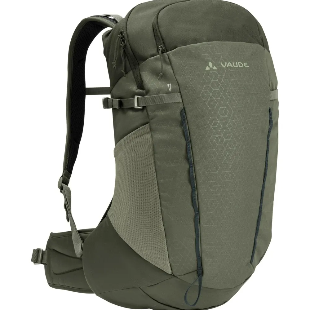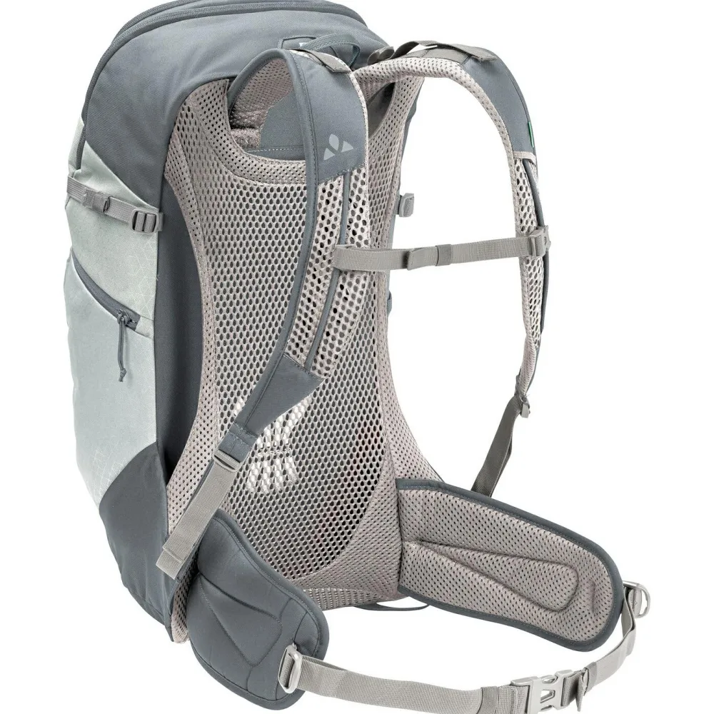 Vaude fertigt den Agile Air 26 Wanderrucksack fast vollständig aus recyceltem Polyester und schützt seine Oberfläche mit einer wasserabweisenden Eco Finish Behandlung. Der Wanderrucksack mit 26 Liter Volumen verfügt über ein bestens belüftetes Aeroflex 3D Rückensystem und ist mit komfortablen ErgoShape Schultergurten ausgestattet. So sitzt der Rucksack perfekt und überzeugt beim Wandern durch angenehme Ventilation und hervorragende Bewegungsfreiheit. Ein gepolsterter Hüftgurt und ein Brustgurt ergänzen das Tragesystem, so dass sich zwischen 3 und 8 kg Last bequem beim Wandern transportieren lassen. Der Vaude Rucksack hat eine frontale Daisychain, eine Stockhalterung und extra Front- und Seitentaschen.