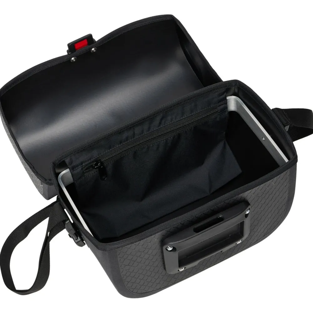 Alternativ kannst Du die ganze Lenkertasche mitnehmen und sie mit dem abnehmbaren Tragegurt als Umhängetasche bei Dir führen.