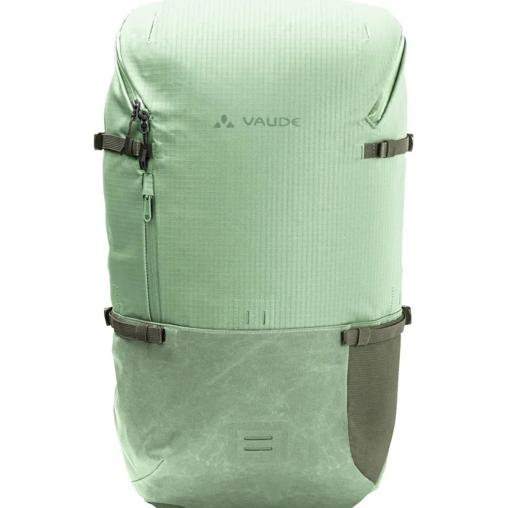 Mit wasserabweisendem Reißverschluss am Deckel, sowie PU-Beschichtung und Eco Finish Oberflächenbehandlung bietet der Citygo 30 II Rucksack guten Schutz vor Nässe und Schmutz. Der Vaude Rucksack bietet 30 Liter Stauraum und ist mit ergonomisch geformten ErgoShape Schultergurten, Brustgurt, Hüftgurt und gepolstertem Vent Comfort Kontaktrücken ausgestattet. Im Inneren lässt sich ein 15,6“ großes Notebook bequem verstauen und für die Trinkflasche steht ein externes Stretch-Fach an der Seite bereit. Schlüssel-Clip, Organizerfach und aufgesetzte Handytasche ergänzen den vielseitigen Allround-Rucksack.