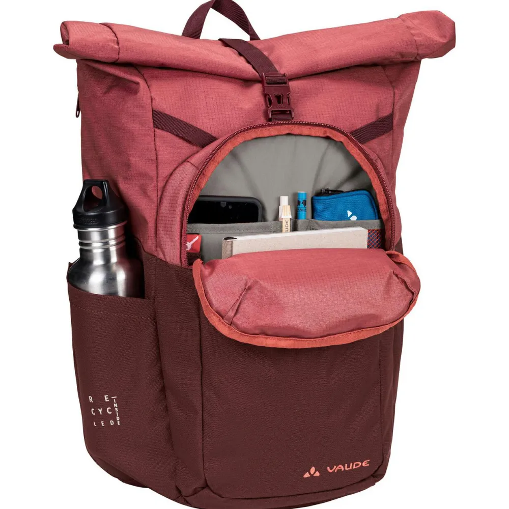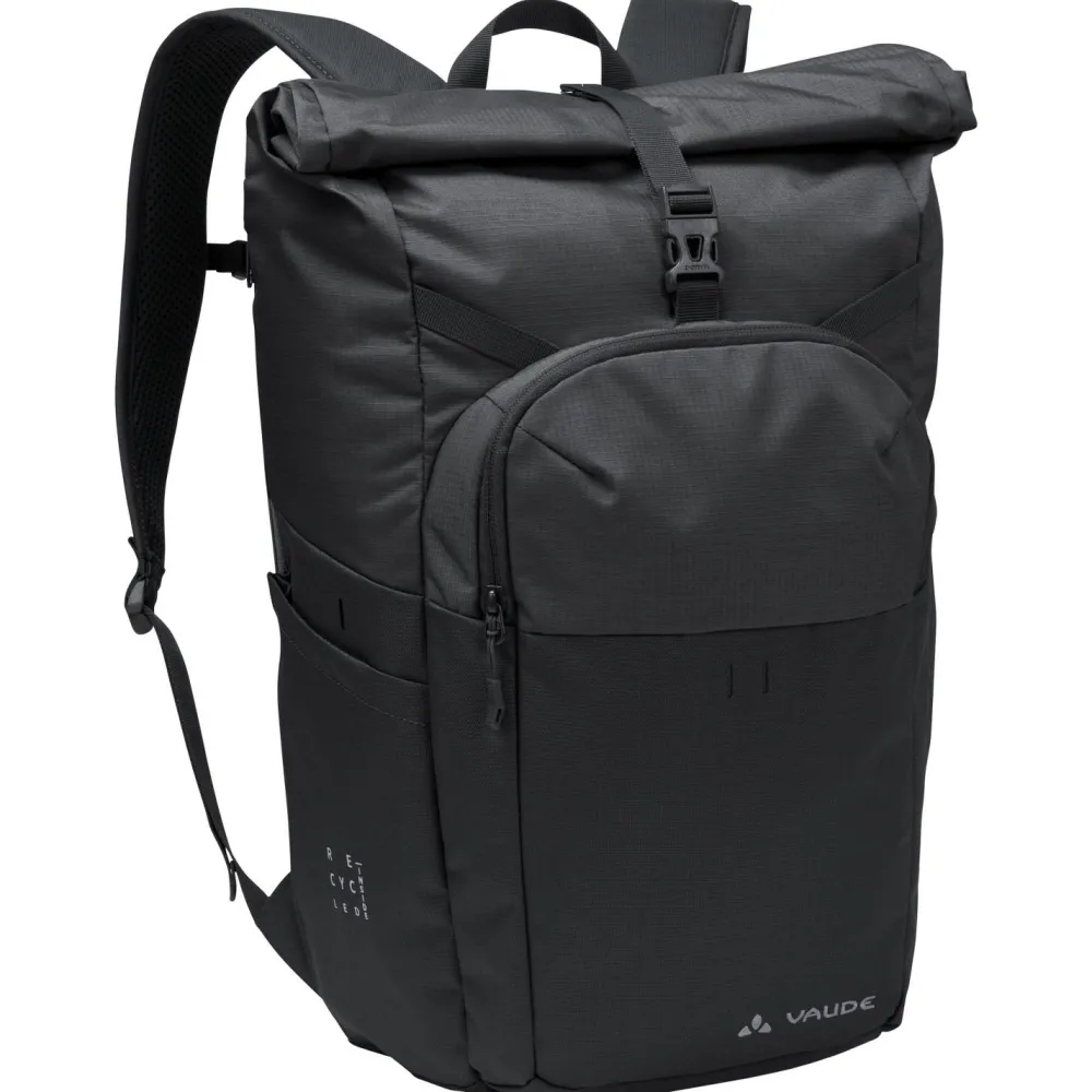 In den Okab II Daypack von Vaude passen 25 Liter Gepäck, die sie bequem mit einem Wickelverschluss verschließen lassen. Der Rucksack besteht aus 600D Polyester, das fast vollständig aus recyceltem Material gewonnen wird. Für maximale Vielseitigkeit und Alltagstauglichkeit verfügt der Rucksack über ein Notebookfach für Notebooks und Tablets bis 13,3“ Größe und ein extra Frontfach mir Reißverschluss. Darin befindet sich ein Organizerfach für alle wichtigen Accessoires. Der urbane Rucksack ist am Rücken und an den Schultergurten gepolstert und verfügt zusätzlich über einen abnehmbaren Brustgurt.