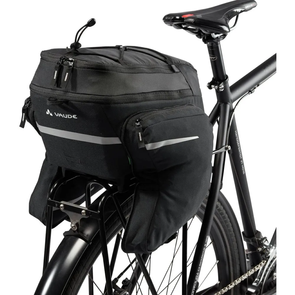 Radfahrer können in der Gepäckträgertasche Silkroad Plus UniKlip 16 von Vaude ihr Gepäck praktisch verstauen! Die robuste Tasche lässt sich unkompliziert am Gepäckträger befestigen oder bei Bedarf mit einem verstellbaren Schulterträger transportieren. Mit dabei ist eine Regenhülle, die die Tasche vor Nässe und Schmutz schützt. Damit eine übersichtliche Ordnung herrscht, gibt es neben einem großen Hauptfach, kleine Seitentaschen. Ein Gummizug am Deckel ist praktisch für die Befestigung von Jacken. Für ausgedehnte Radtouren ist die Silkroad ein kompetenter Partner!