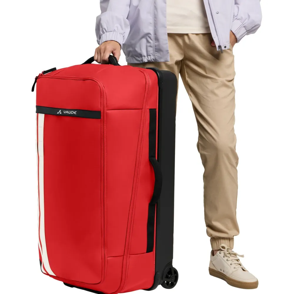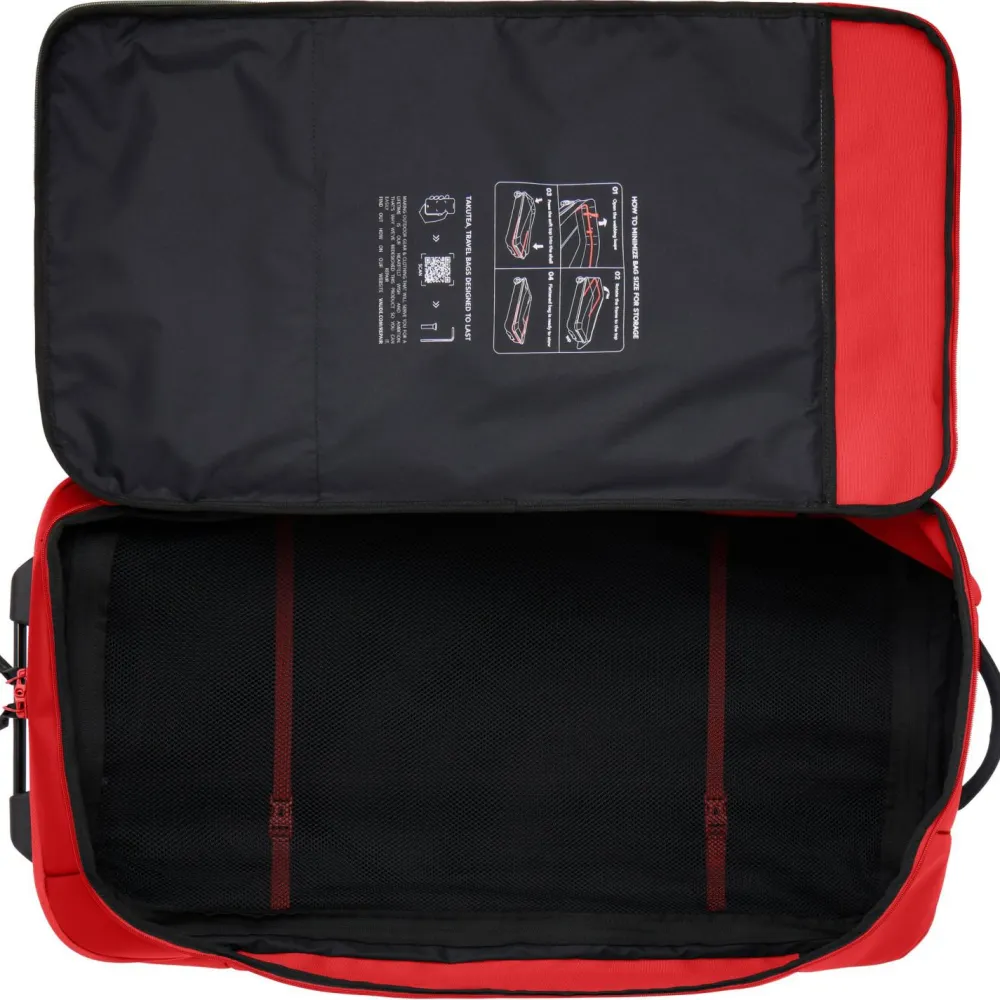 Der Takutea 90 reist mit einem ausziehbaren Teleskopgestänge und zwei Tragegriffen, die von leichtgängigen und austauschbaren Rollen sowie Standfuß und Kantenschutz ergänzt werden. Zu den weiteren Vorteilen gehören die gut zugängliche und übersichtliche Gepäckaufteilung und die Möglichkeit, den Reißverschluss-Schieber mit einem TSA-Schloss zu sichern. Das große, aufklappbare Hauptfach wird ergänzt durch den Zwischenboden, die Netzinnentasche, das Reißverschluss-Fach auf der Vorderseite und mehrere Befestigungsmöglichkeiten. Damit ist das Gepäck des Takutea 90 Rollenkoffers jederzeit sicher aufbewahrt!