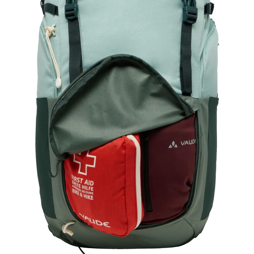 Der Women’s Skomer Tour 34+ von Vaude ist ein vielseitiger Tourenrucksack für Wanderungen und Naturtrips aller Art. Trotz seines robusten Materialien und der üppigen Ausstattung bringt er nur ein Fliegengewicht von weniger als anderthalb Kilo auf die Waage. Das sorgt für leichtfüßiges Unterwegssein mit Bewegungsfreude, ebenso wie die anatomisch geformten ErgoShape-Women Schultergurte und das hocheffiziente Aeroflex 3D 2.0 Belüftungssystem des ebenfalls frauenspezifisch designten Netzrückens. Das Tragesystem ist höhenverstellbar und der abnehmbare Deckel lässt sich als Kulturbeutel nutzen.