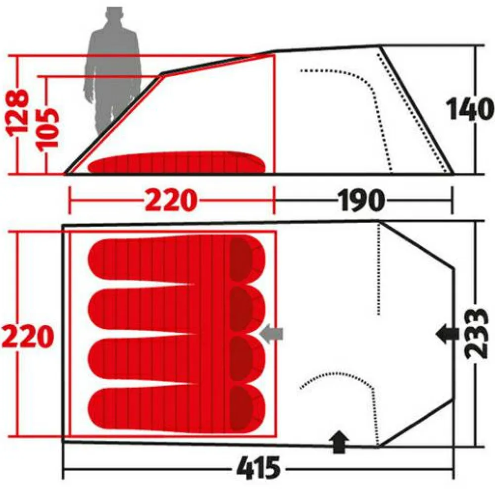 Das Intrepid 4 von Wechsel ist ein Tunnelzelt, das sich für bis zu vier Personen eignet. Es ist mit drei Eingängen und einer Apside ausgestattet. Durch die etwas steilere Form des Vorzeltes kann gut darin sitzen und die gesamte Fläche nutzen. Dadurch hat man mehr Stauraum für das Gepäck und die Ausrüstung. Das Innenzelt lässt sich im aufgebauten Zustand ganz oder teilweise ein- und aushängen.Taschen im Innenzelt bieten zusätzlich Stauraum im Zelt. Die Apsis besitzt zwei Seiteneingänge und eine aufrollbare Fronteingang, die bei geschlossener Seitentür einen exzellenten Wind- und Wetterschutz bietet. Die schließbare Belüftung am Innenzelt, sowie vier Apex Lüfter am Außenzelt sorgen für eine ideale Belüftung. Das Zelt hat eine aerodynamisch günstige Form und hält auch windigem Wetter stand.Praktisch, stabil und geräumig – mit dem Intrepid 4 kann das nächste Outdoor-Abenteuer losgehen!