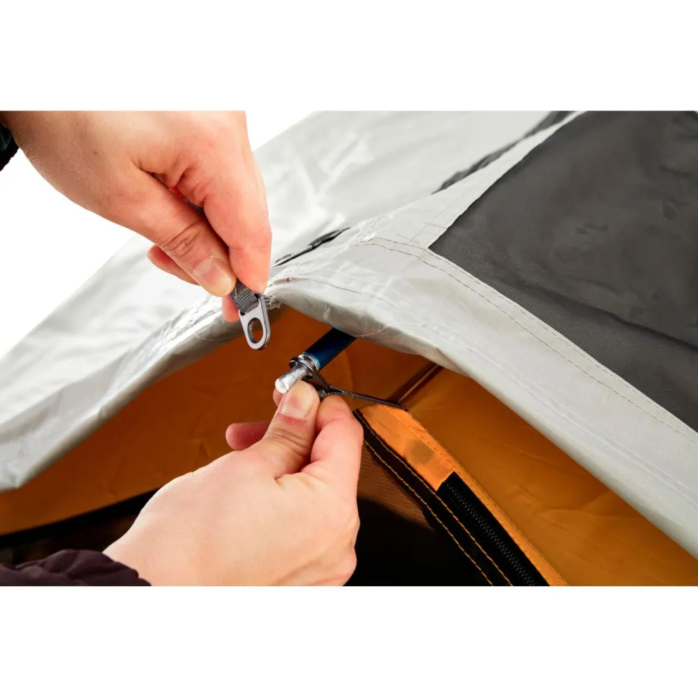 Durch das überkreuzte Gestänge kann das Venture 3 3-Personen Zelt von Wechsel stets optimal gegen den Wind abgespannt werden. Die Befestigungspunkte am Außenzelt sind mit robustem Material verstärkt. Reflektierende Abspannleinen sorgen nachts für erhöhte Sichtbarkeit. Beidseitige Ventilationsklappen auf der Oberseite ermöglichen eine angenehme Belüftung im Innenzelt. Durch das rechteckig geschnittene Innenzelt passen drei Isomatten in Standardgröße bequem nebeneinander. Große Netztaschen aus Mesh-Gewebe bieten beim Camping viel Platz für Deine persönlichen Gegenstände. Bei warmen Bedingungen kann das Außenzelt mit dem separat erhältlichen Groundsheet ohne das Innenzelt aufgebaut werden.