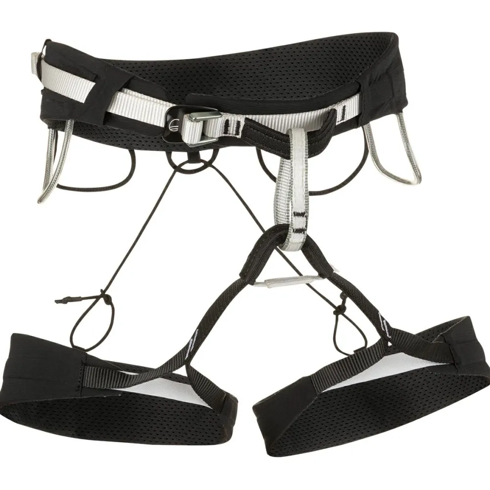 Der Gurt besteht aus besonders reißfestem Ripstop-Material. Die Passform lässt sich an der Hüfte mit einer Aluminiumschnalle optimal einstellen. Die Beinschlaufen sind hinten mit elastischen Zugbändern höhenverstellbar.