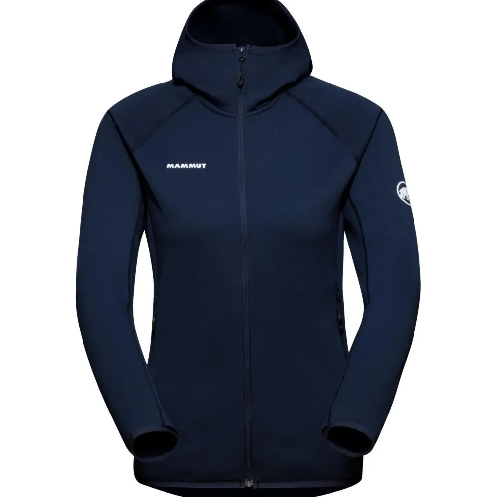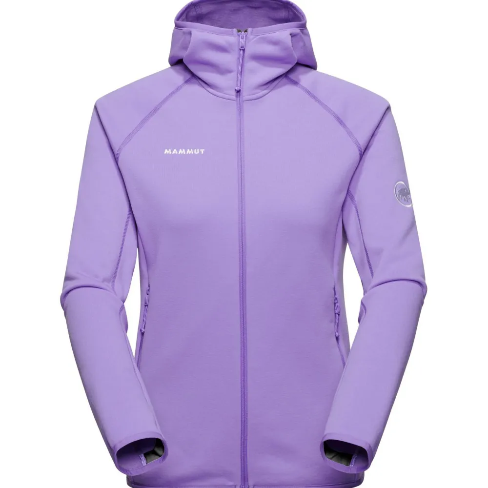 Die Women’s Aconcagua Midlayer Jacket Fleecejacke verfügt über eine elastische Kapuze und zwei hochangesetzte Fronttaschen, die auch mit aufgesetztem Rucksack oder angelegtem Klettergurt gut zu erreichen sind. Außerdem ergänzen ein hoher Kragen, ein Frontreißverschluss mit Kinnschutz und Untertritt sowie praktischen Daumenschlaufen an den Ärmelenden die Fleecejacke. Je nach Witterung trägt sich die Mammut Jacke bequem beim Wandern oder Klettern.