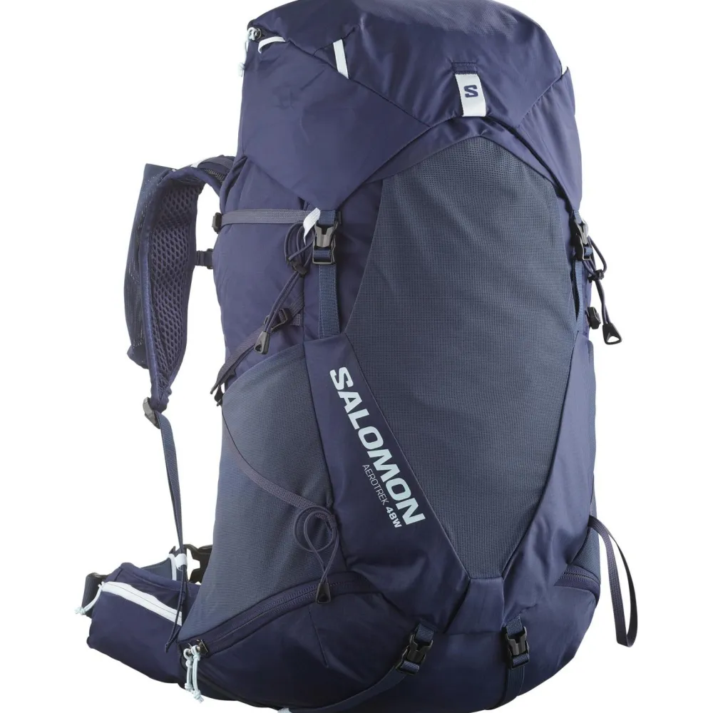 Auch bei langen Etappen bleibt der Tragekomfort nicht auf der Strecke: Das ausgeklügelte Tragesystem mit gepolsterten Schulterträgern, Brust- und Hüftgurt verteilt das Gewicht optimal und entlastet Deinen Rücken spürbar. Ein stabiler Tragegriff erleichtert das Handling beim Auf- und Absetzen. Trotz des großzügigen Stauraums wiegt der Women’s Aerotrek 48 nur etwa 1,2 Kilo – damit bist Du auch bei voller Beladung angenehm unterwegs. Die jahrzehntelange Erfahrung von Salomon aus den französischen Alpen steckt in jedem Detail dieses Rucksacks – das spürst Du bei jedem Schritt.