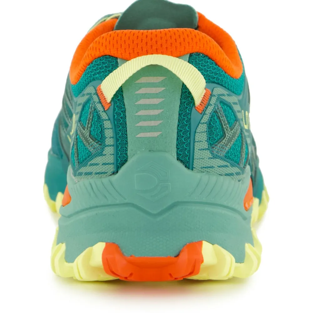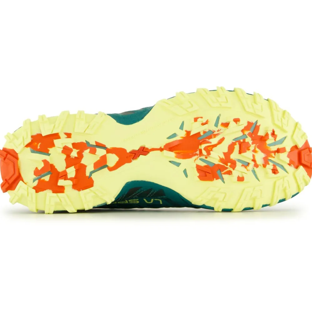 Die Zwischensohle dieser Schuhe besteht aus EVA und ist für zusätzlichen Schutz mit einer Steinschutzplatte versehen. Damit wird der Aufprall sehr gut absorbiert und es stellt sich ein sehr angenehmes Laufgefühl ein. Durch die FriXion Red Außensohle kannst Du Deine Kraft perfekt in Vortrieb umwandeln, egal ob weicher Feldweg oder harter Asphalt. Abgerundet wird das Design der Women’s Bushido lll von La Sportiva durch die praktischen Anziehschlaufen und die recycelten Schnürsenkel. Perfekt für mittlere und kurze Distanzen im Gelände!