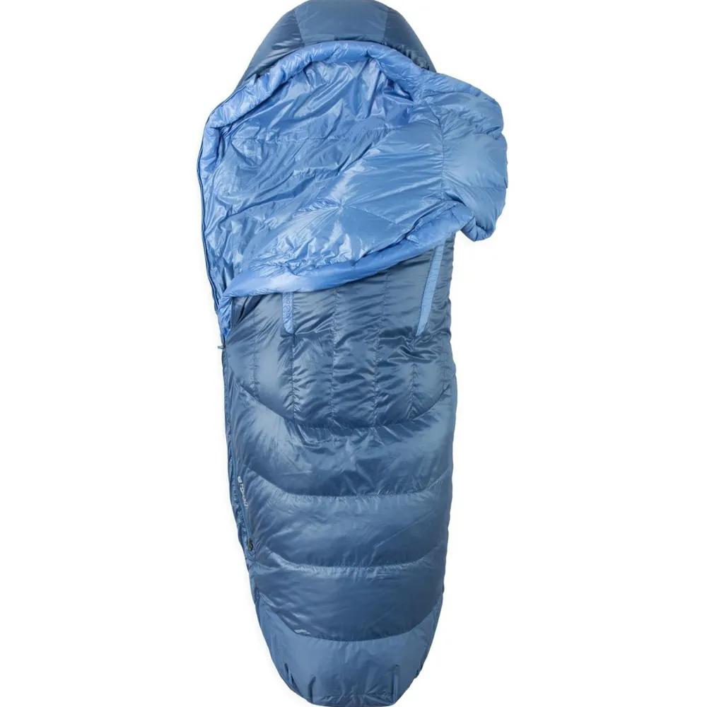 Nemo befüllt den Women’s Disco 30 Endless Promise Daunenschlafsack mit einer hochwertigen Füllung aus RDS-zertifizierter Daune mit 650 cuin Bauschkraft. Als Obermaterial und Innenmaterial dient recyceltes Polyester, das zusätzlich mit einer wasser- und schmutzabweisenden DWR-Behandlung ausgestattet ist. So bleibt die Daunenfüllung auch bei Feuchtigkeit zuverlässig trocken. Der leichte Schlafsack wird mit einem praktischen Packsack geliefert, in dem sich er sich platzsparend verstauen und transportieren lässt. Mit Ventilationsöffnungen auf der Vorderseite, einem integrierten Wärmekragen und einer warm isolierten Kapuze ergänzt Nemo den funktionellen Schlafsack.