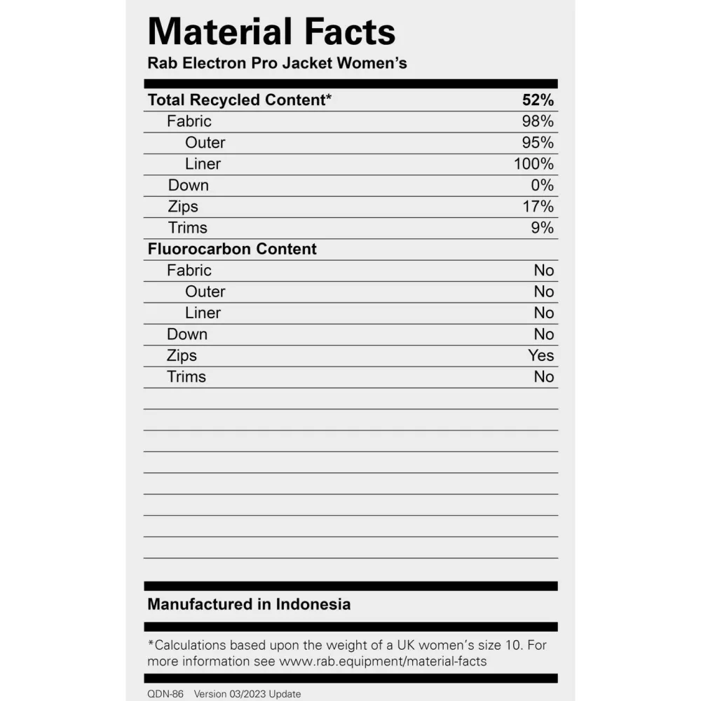 Bei Bergsport bietet die Women’s Electron Pro Jacket Daunenjacke von Rab eine exzellente Mischung aus Wärmeleistung und Wetterschutz. Sie ist aus strapazierfähigem Pertex Quantum Pro gefertigt und ist wasserdicht und windundurchlässig. Die wetterfeste PU-Beschichtung am Obermaterial wird durch eine zusätzliche DWR Behandlung ergänzt, die einen effizienten Abperleffekt von Wassertropfen und Schmutzpartikeln ermöglicht. Die isolierenden Kammern der Daunenjacke sind mit hydrophober Gänsedaune aus Europa befüllt und bieten mit 800 cuin eine hervorragende Bauschkraft und ein super Verhältnis von geringem Eigengewicht zu maximaler Isolationskraft. Für angenehme Wärme am Hals und am Kopf verfügt die Women’s Electron Pro Jacket über eine verstellbare Kapuze, die auch bestens über den Kletterhelm passt. Die Rab Jacke ist angenehm bewegungsfreundlich und verfügt über zwei hoch angesetzte Fronttaschen, die auch mit angelegtem Klettergurt optimal zu erreichen sind.